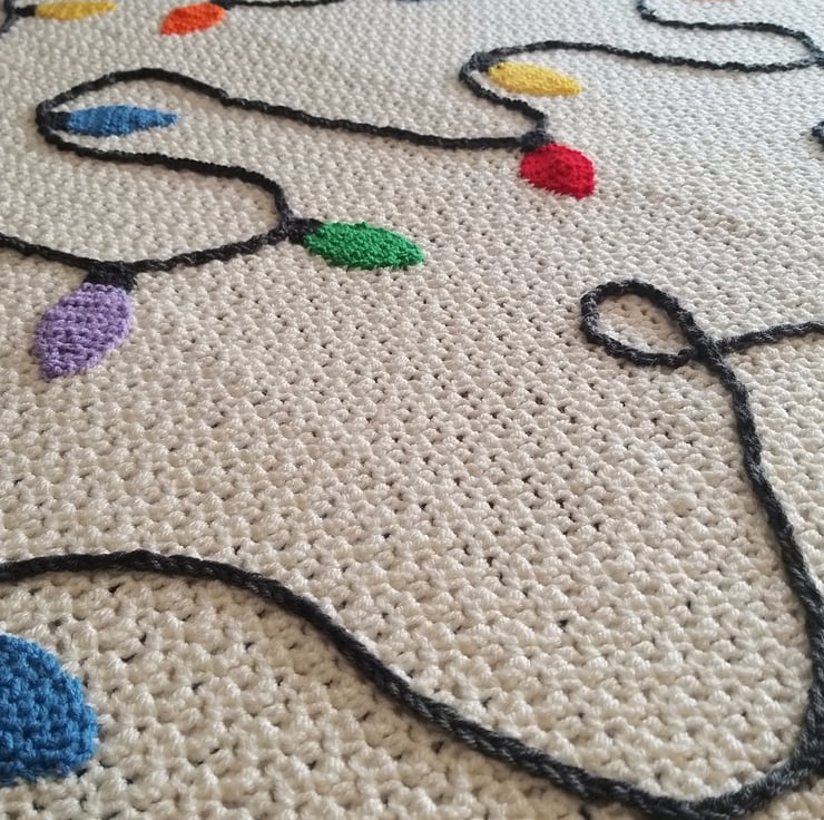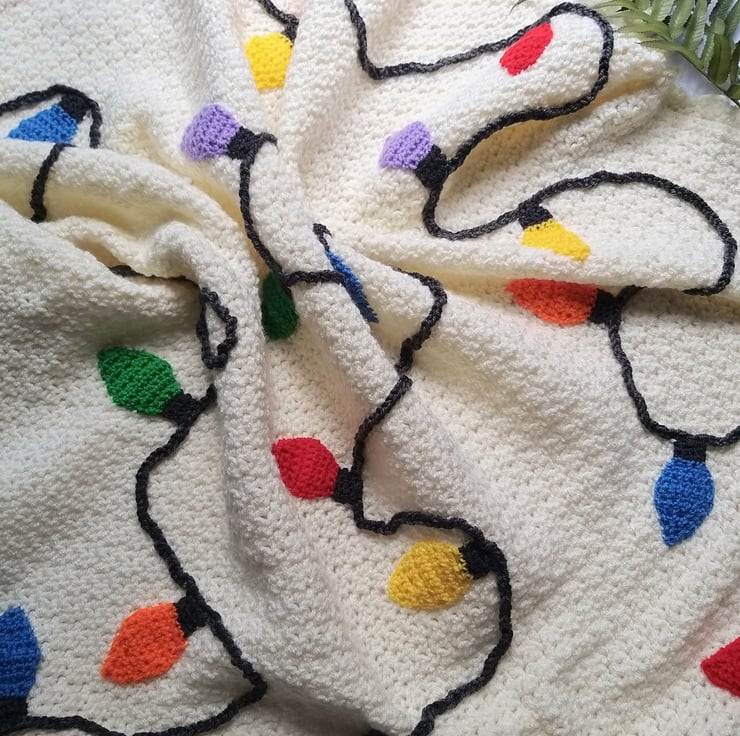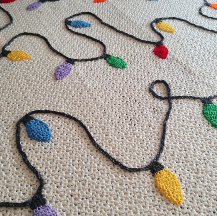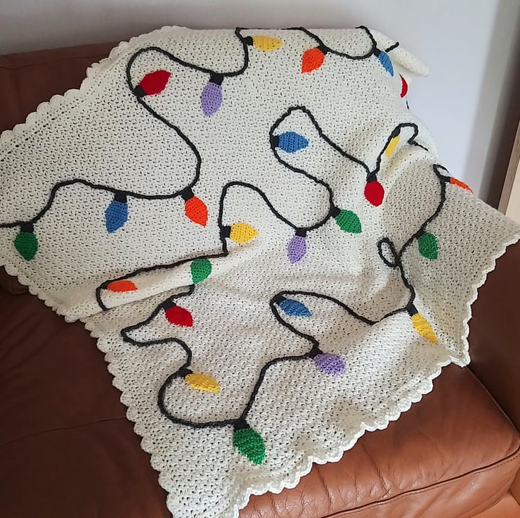 It has colourful tree lights strung across it which are all crocheted and stitched onto the blanket by hand. Finished off with a gentle scalloped border.
