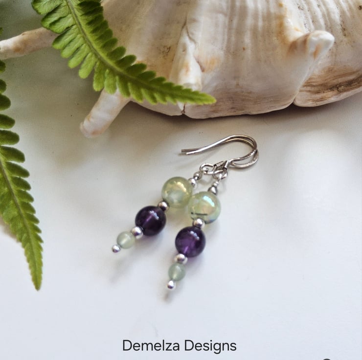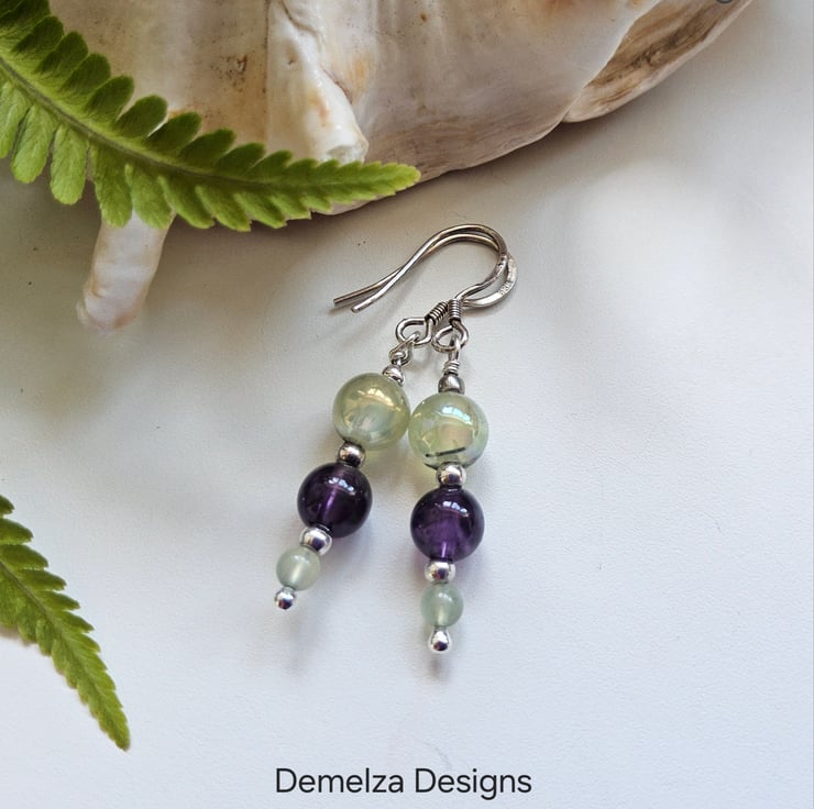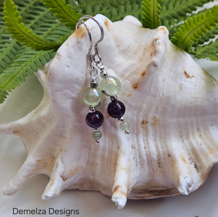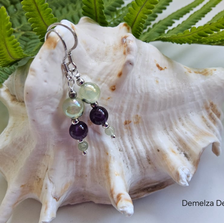 A lovely feminine pair of earrings designed and hand crafted in Cornwall using 8mm 6mm and 4mm round cut Prehite and Zambian Amethyst smooth polished gemstone beads.