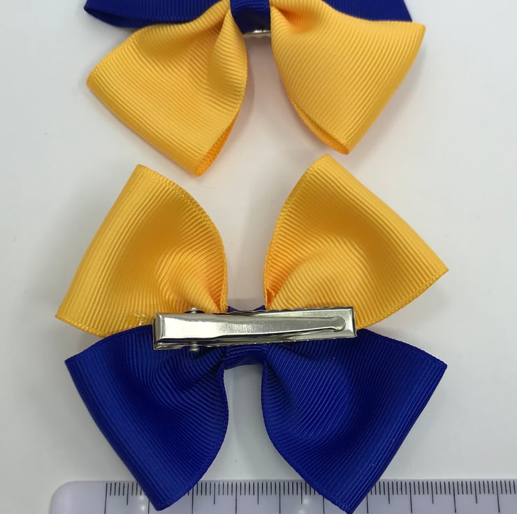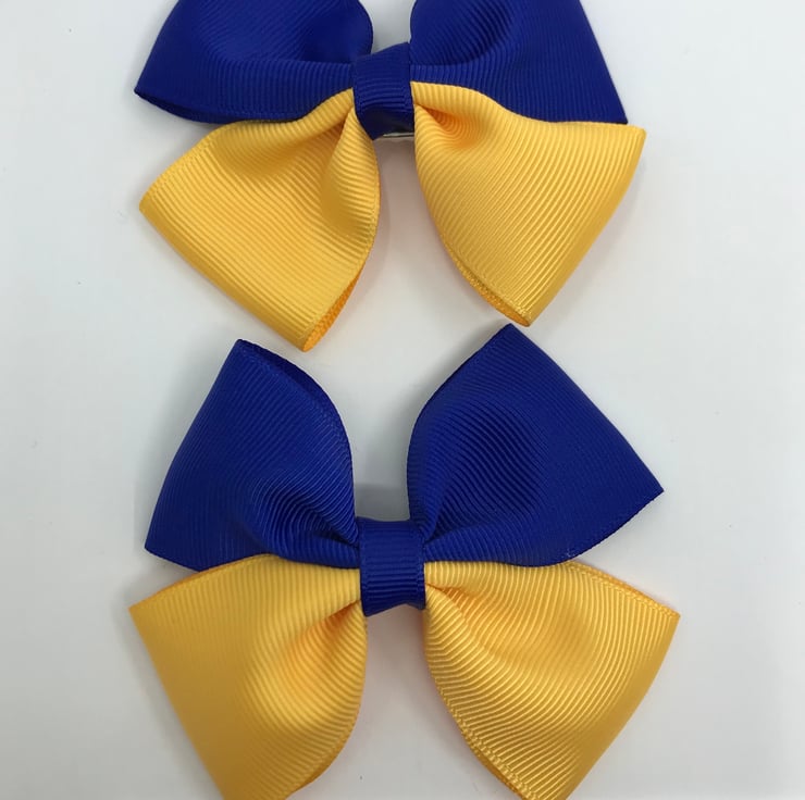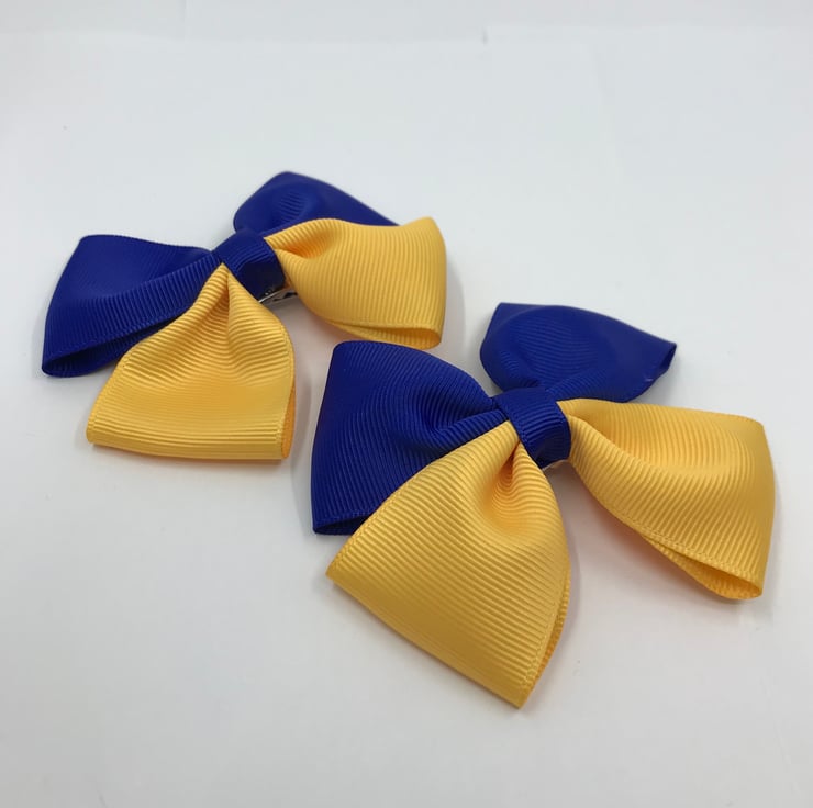 Our two tone double bows are handmade here in our little shop. They are made from the best quality Grosgrain ribbon. These bows are simple and classic and look extremely smart and go well with the cobalt blue and yellow gold School Uniform.