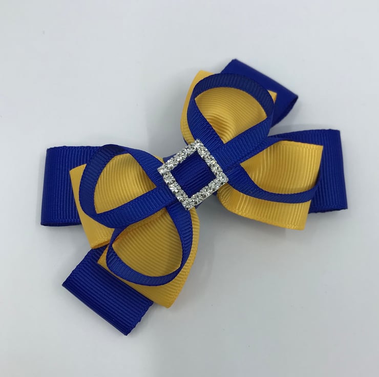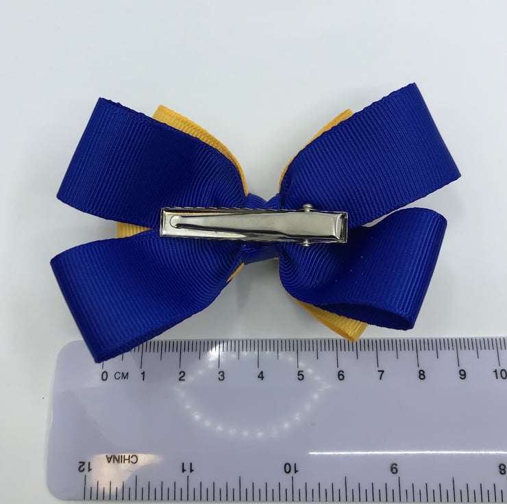 Our double bows are handmade here in our little shop. They are made from the best quality Grosgrain ribbon. These bows are really elegant and look extremely smart and go well with the cobalt blue and yellow gold School Uniform.