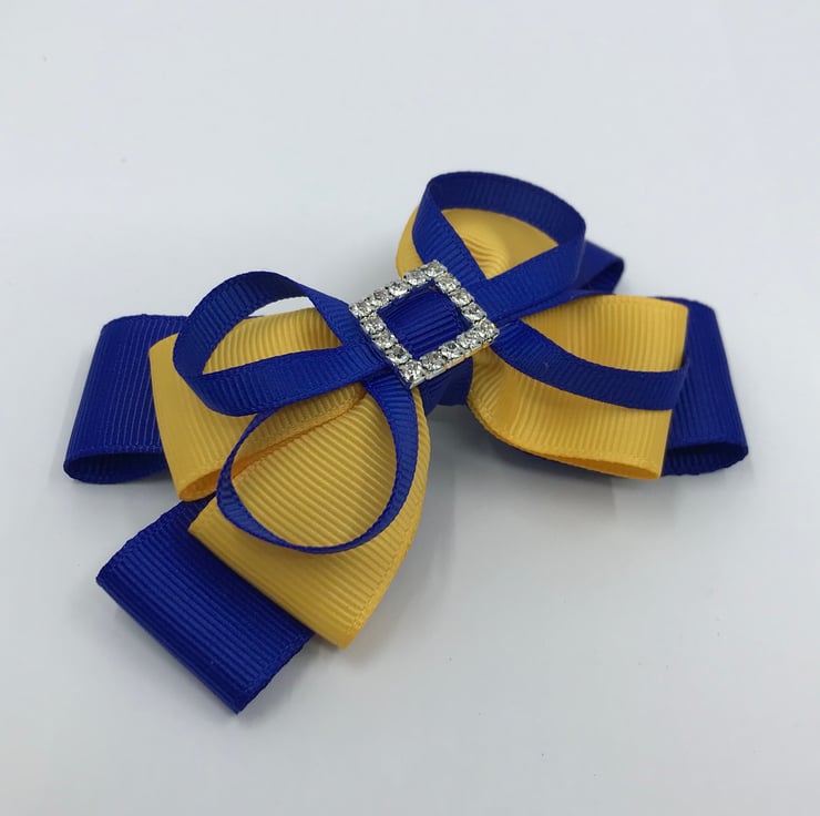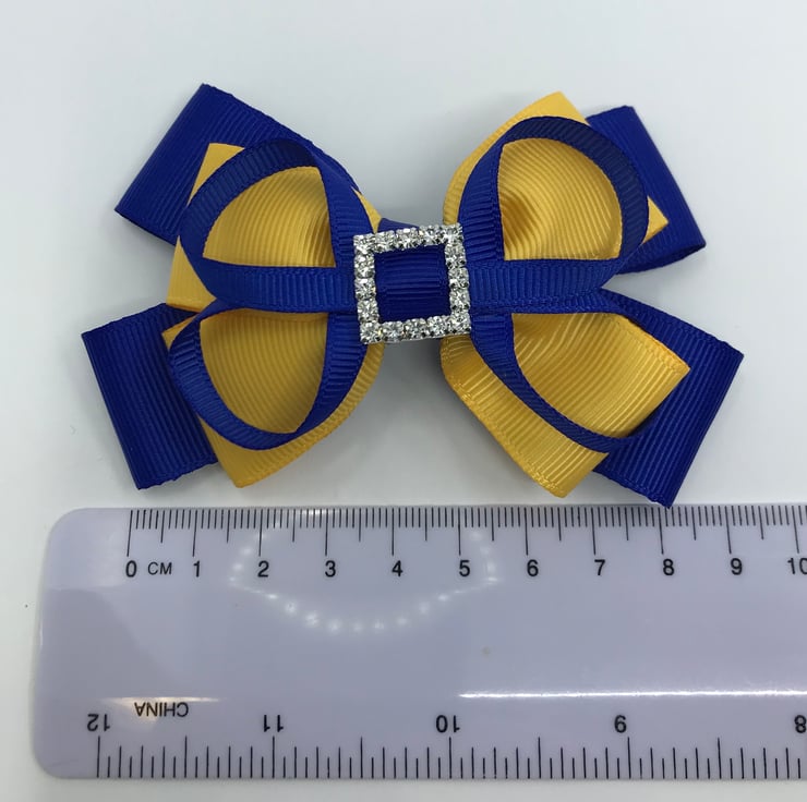 School Cobalt Blue and Yellow Gold Layer Bow with Cobalt Blue Loops on Clip