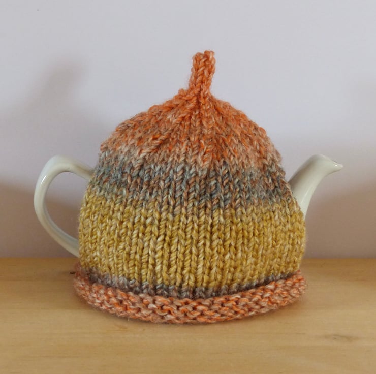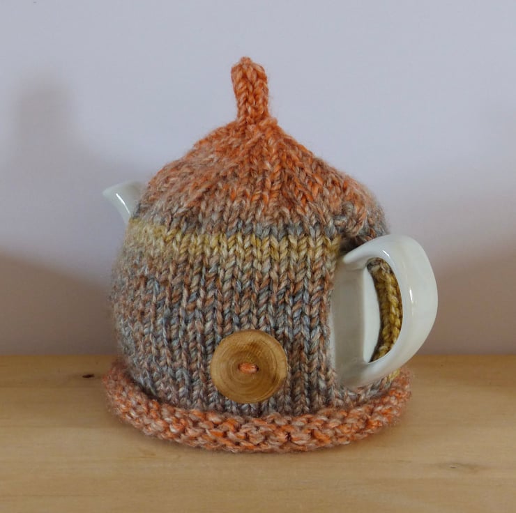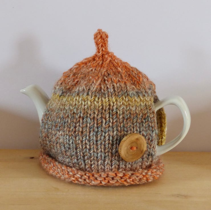 A hand knitted Tea Cosy in a chunky variegated yarn in muted shades of Orange, Brown, Grey and Gold. It has a 'pixie' top and a chunky handmade cherry wood button on the front for decoration.