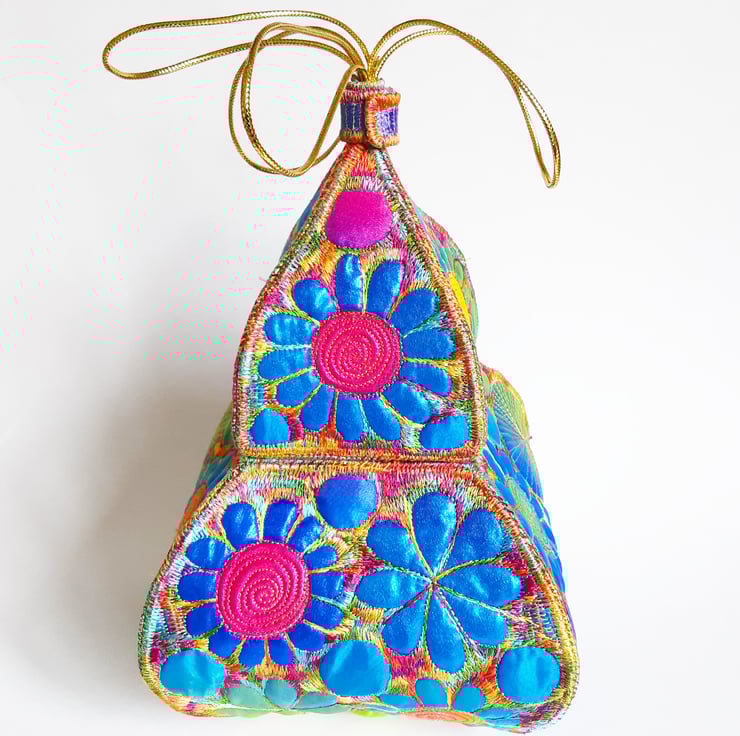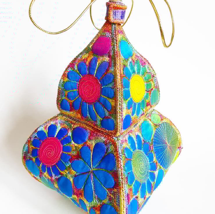 Made from layers of fabric including hand-dyed egyptian cotton and silks using applique and free machine embroidery