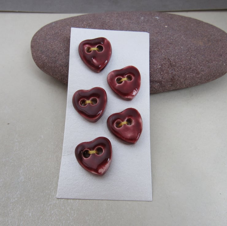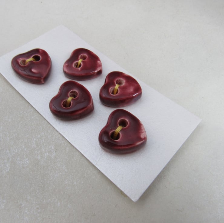 5 small stoneware heart buttons finished with a glossy rose red glaze.