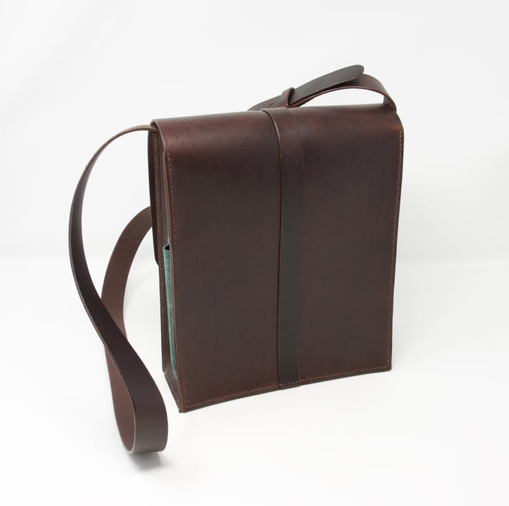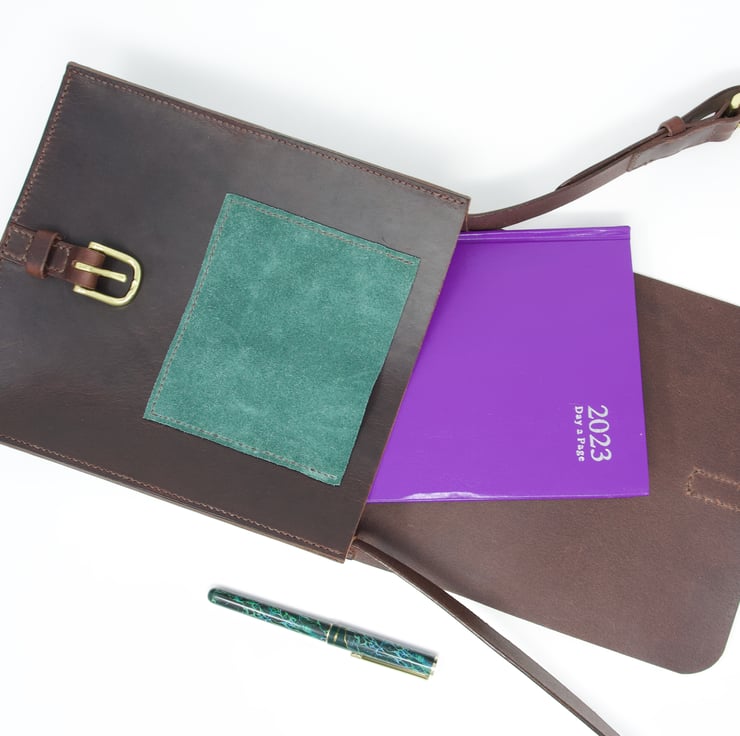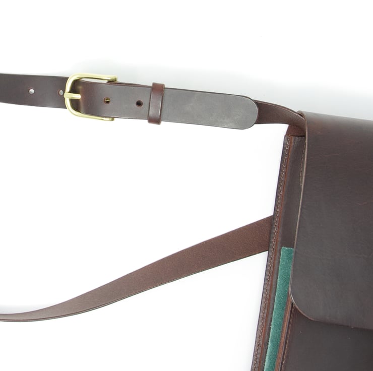 The bag is made from a lovely supple chocolate brown Italian leather with contrasting green pocket details. It is hand-stitched using traditional saddle-stitching methods and natural linen thread and the edges are burnished to give a smooth finish. The buckles are solid brass.