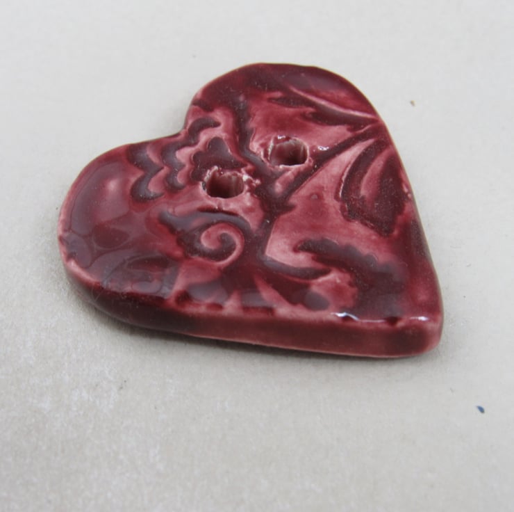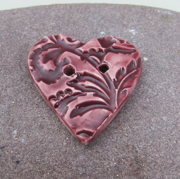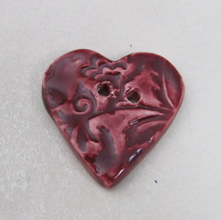 Medium heart shaped stoneware button, textured with a bold leaf and flower motif.