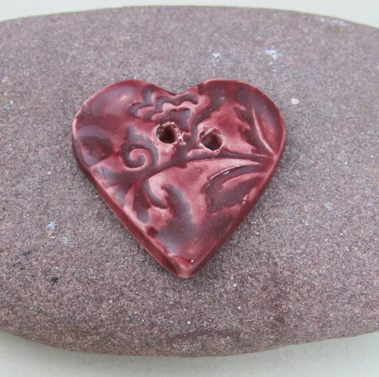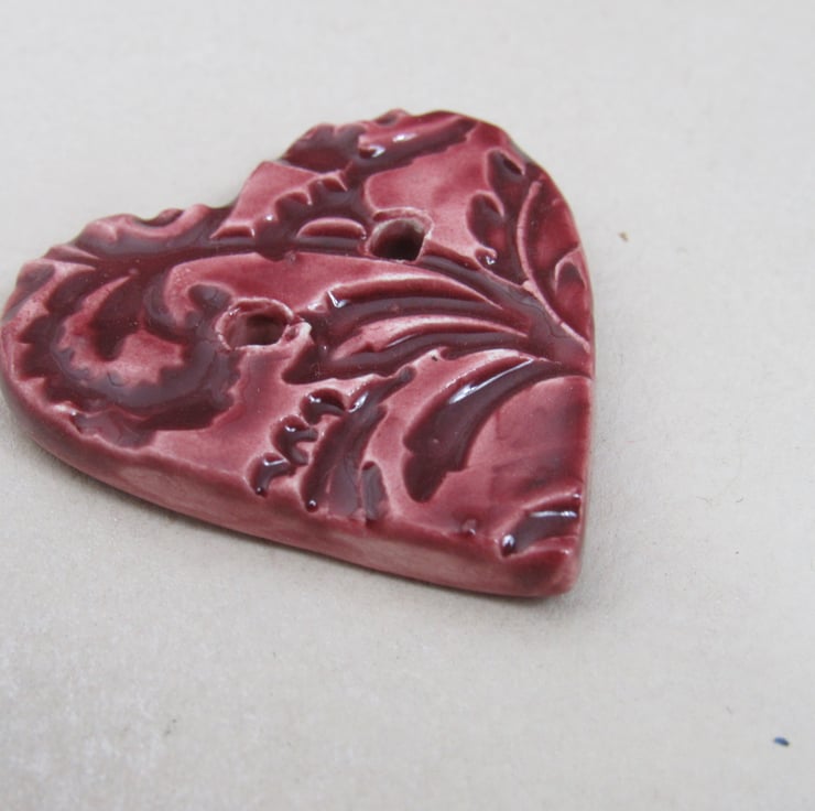 Medium Rose Red Brocade Texture Heart Shaped Ceramic Button