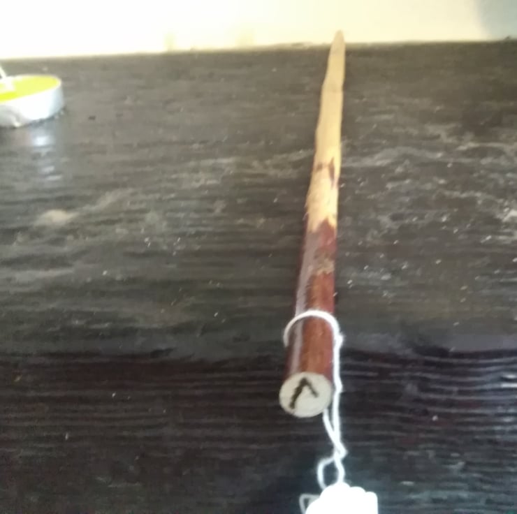 Hand-made from locally sourced and sustainable Blacthorn with wood-burned 'Gateway' and 'Flow' runes. Moon-bathed.