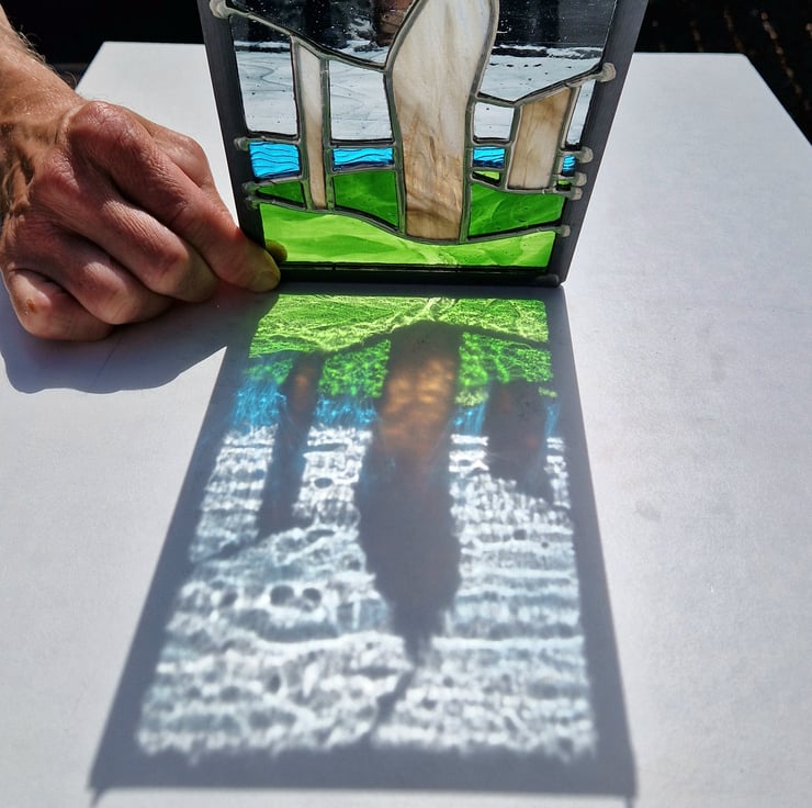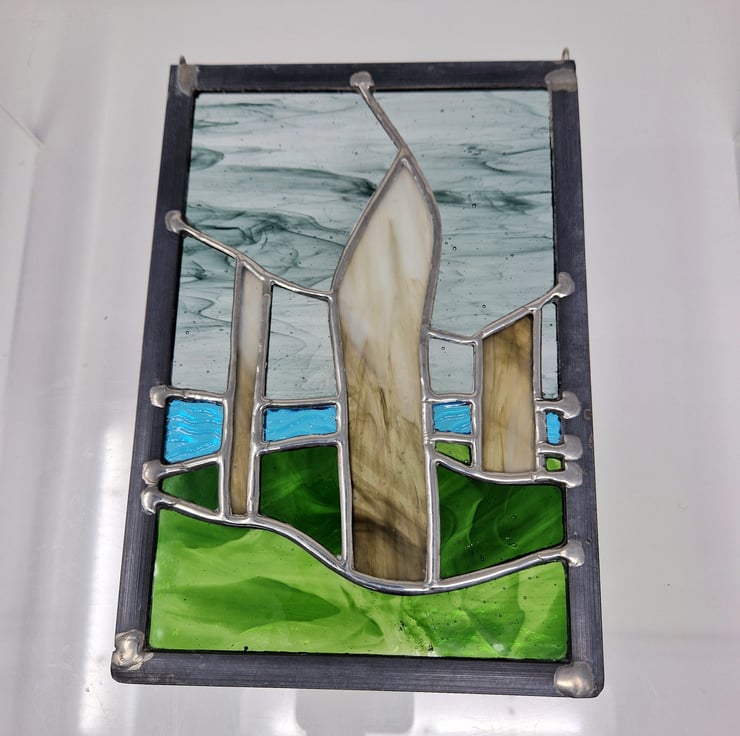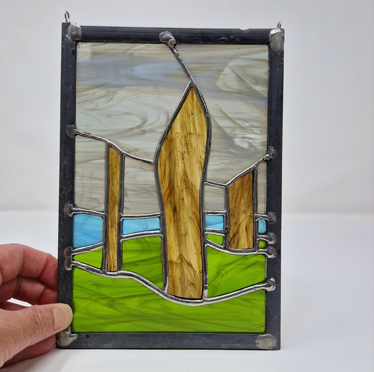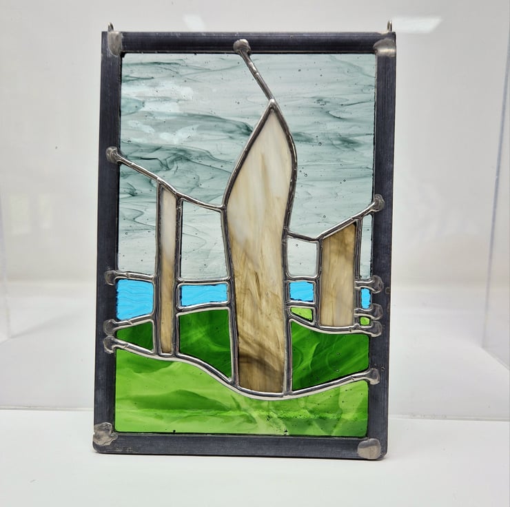 Three standing stones are cut from a translucent pale brown streaky glass. A rippled turquoise for the sea and a swirled green for the grassy foreground.