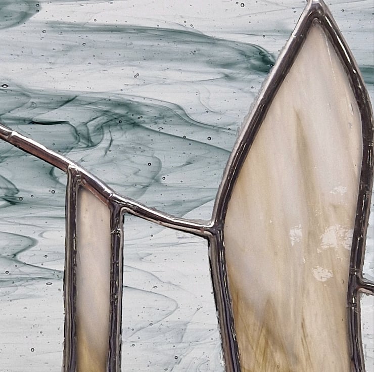 Once cut the edges of each piece are ground then surrounded with copperfoil, placed together and soldered into position. To give a substantial weight and pleasing feel to the panel I have added a lead edge which is then soldered and cemented.