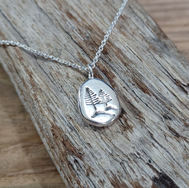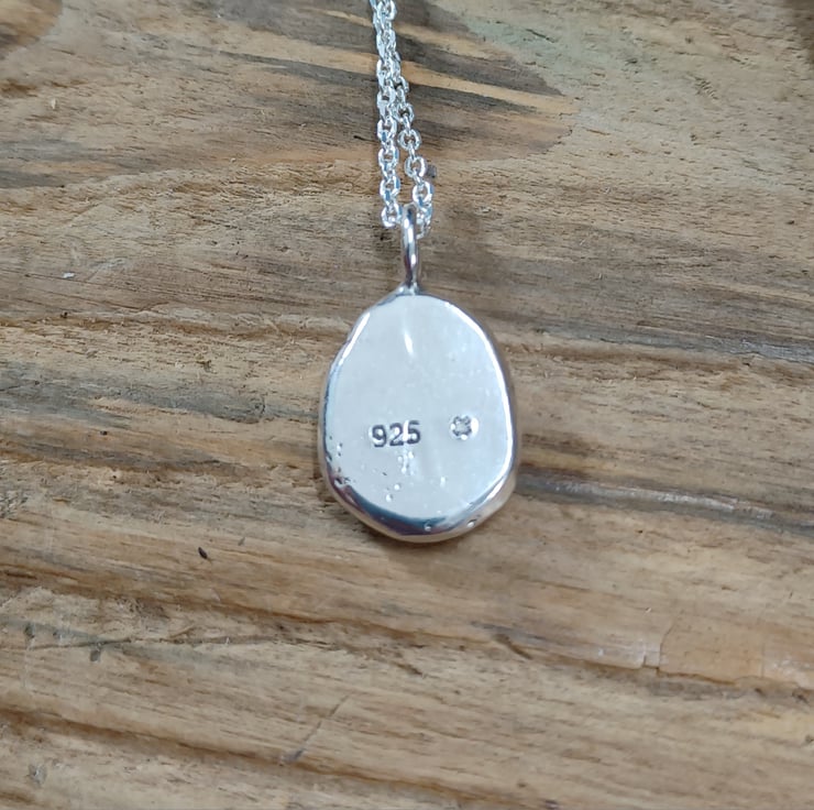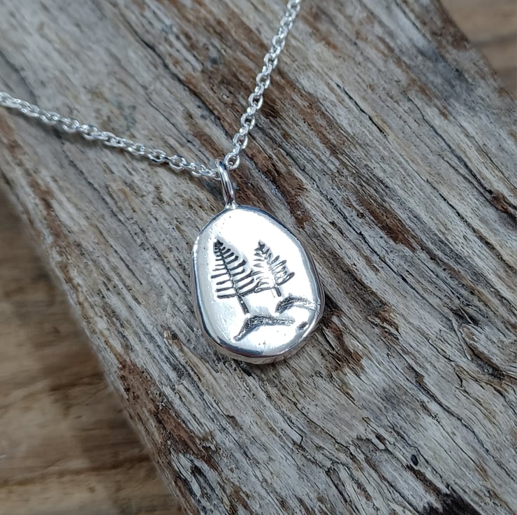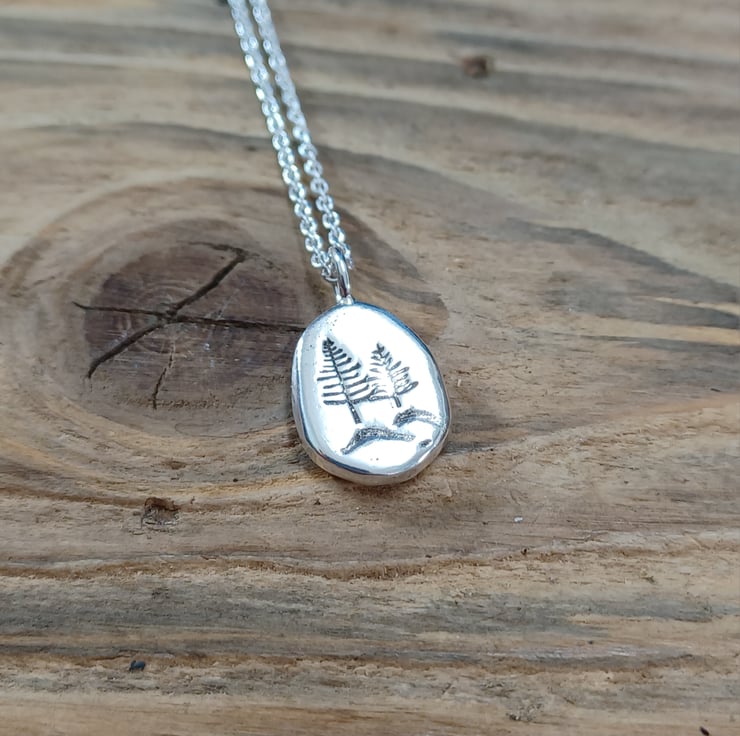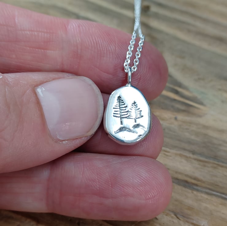 Made from offcuts of sterling silver which have been melted down, shaped, filed, sanded and polished to a nice shine. A couple of alpine trees on little hills have been added.The pendant is suspended from an 18" sterling silver diamond cut trace chain.