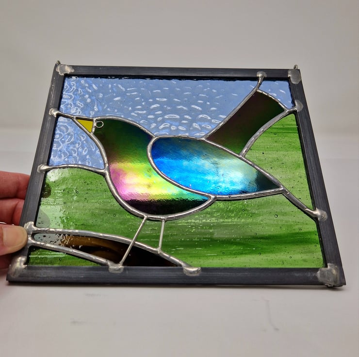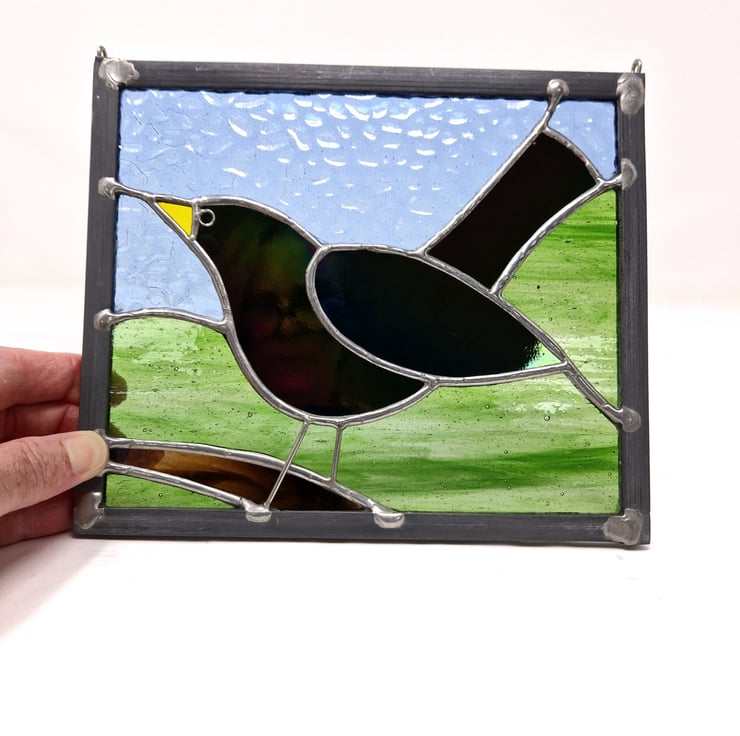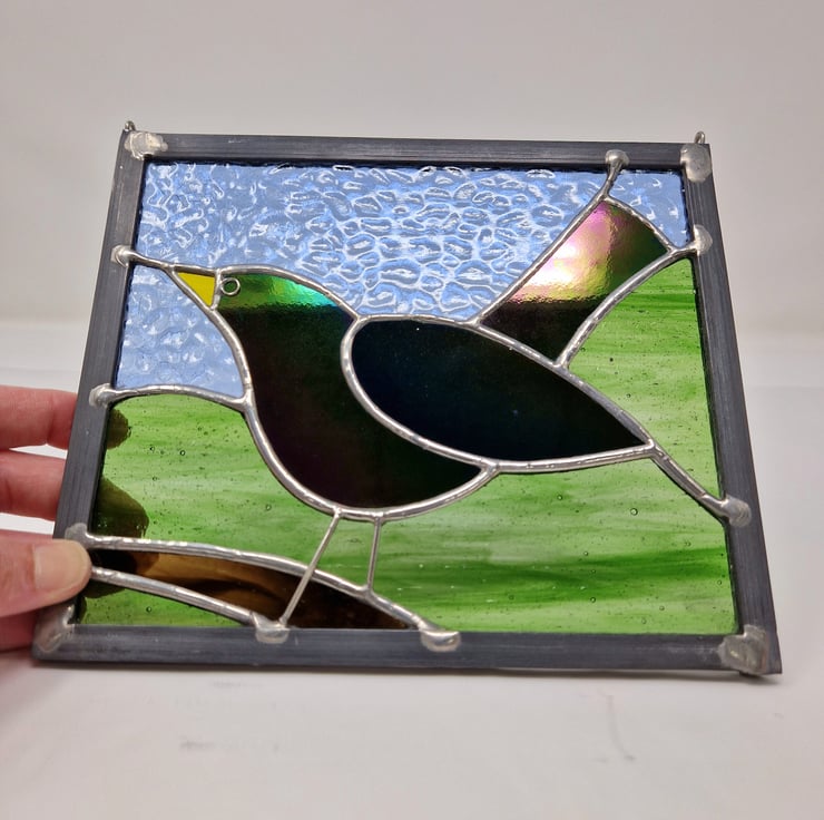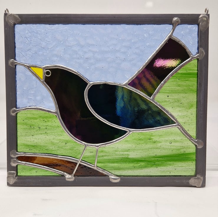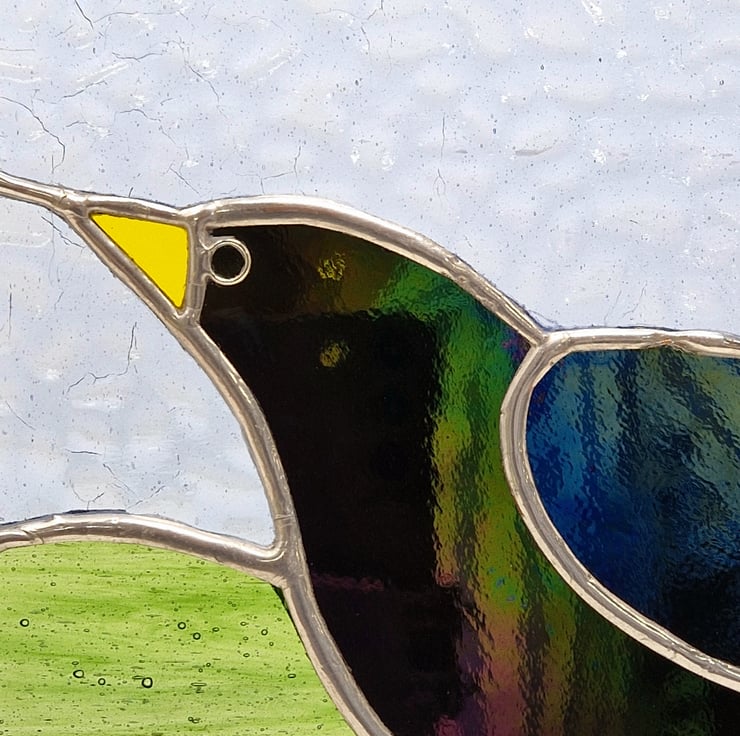 I have cut the blackbird from beautiful iridescent black opaque glass. It reflects pinks and greens in direct light. In contrast I have used a strong vibrant transparent yellow for the beak.