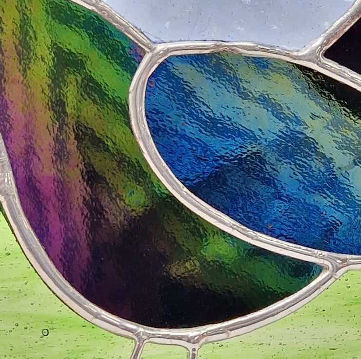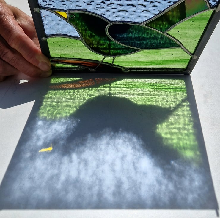 This blackbird panel is made with cut glass, copperfoiled, soldered then given a lead edge to make it a substantial panel.
