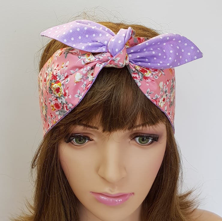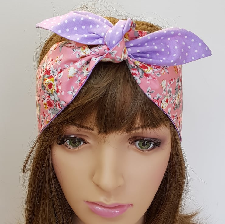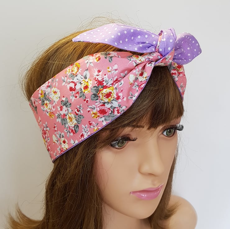 Reversible self tie hair scarf , rockabilly summer cotton headband.