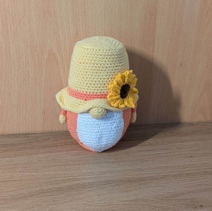 A gnome with sunflower detail. Made from 100% cotton yarn.