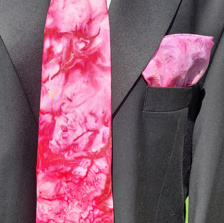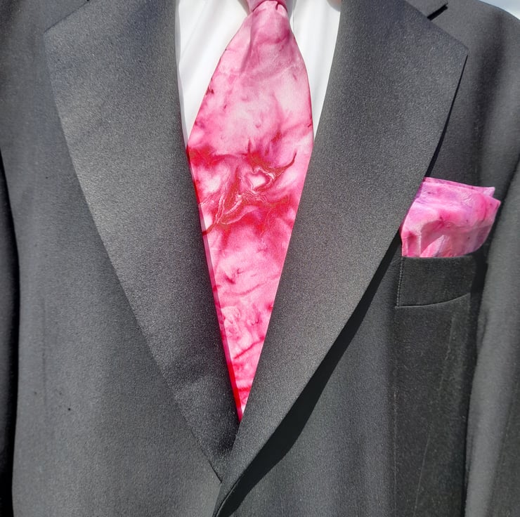 Hand Dyed Pure Silk Tie and Pocket Square Set in Hot Pink. The technique I've use has created fantastic patterns and shadings which makes this set stand out from the crowd ! Perfect for someone who loves something a bit different. It will look fabulous finishing of a special outfit for a wedding, Graduation, Birthday ect !