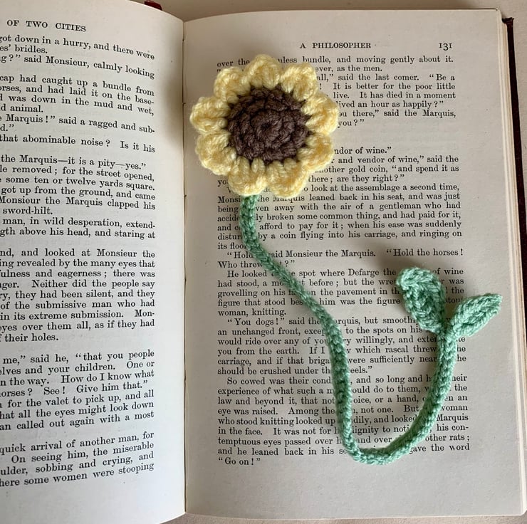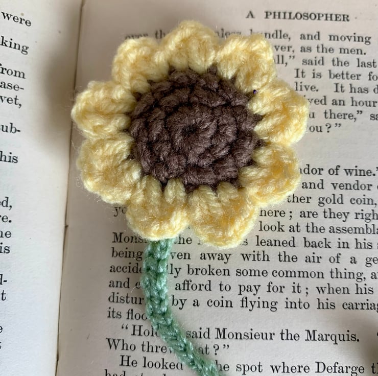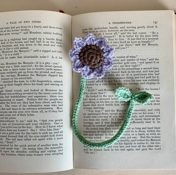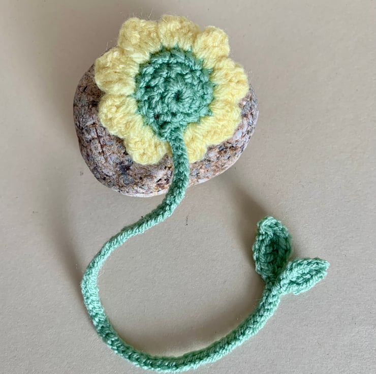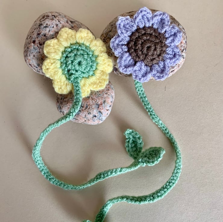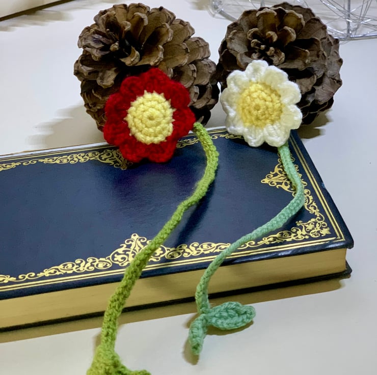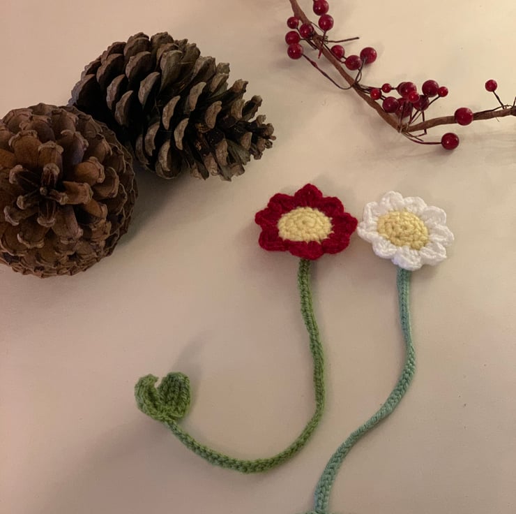 These bookmarks are handmade in my home in Lancashire. Each one is crocheted using acrylic yarn and measures approximately 24cm in length, fitting an average paperback novel. The flower is lightly stuffed with yarn, and measures 5cm in diameter. The cord is made with chain and slip stitch.