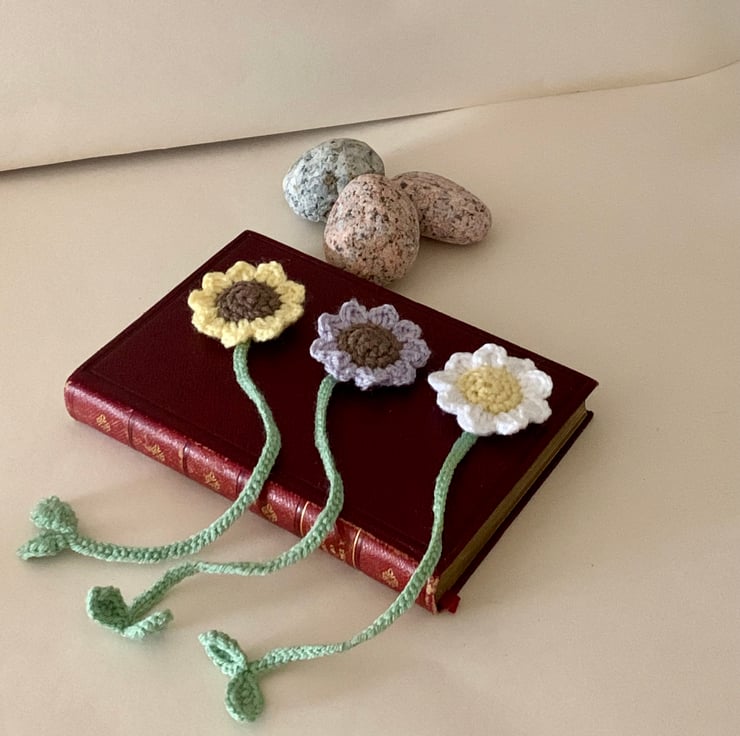 Crochet flower bookmark in lemon yellow, white, lilac or red. Perfect gift for the book worm in your family. Make reading fun with these daisy and sunflower book marks. Handmade gift for book lovers. Great gift for students for school or Uni.