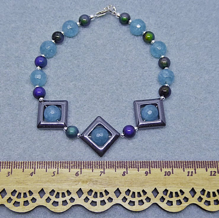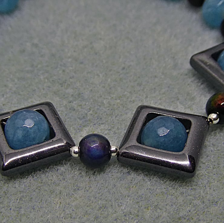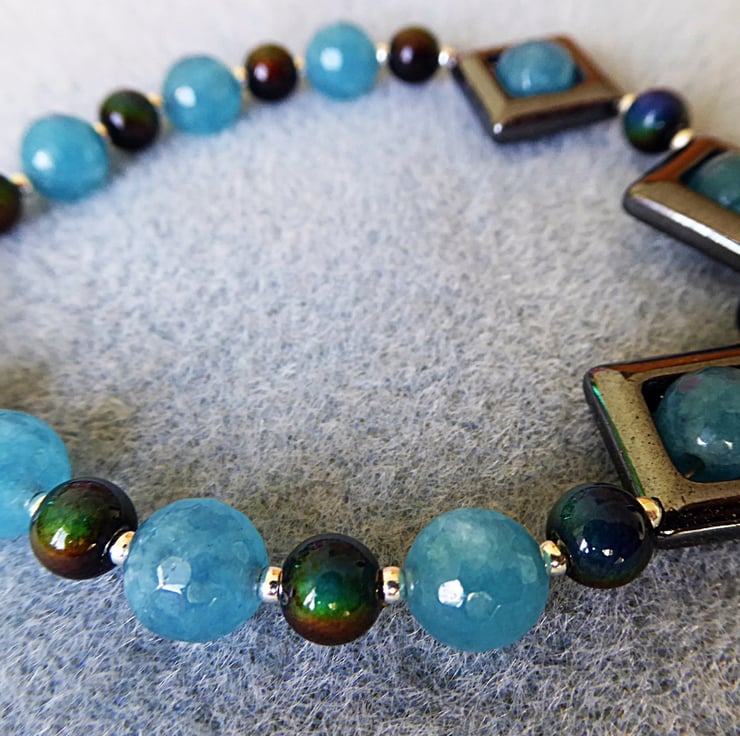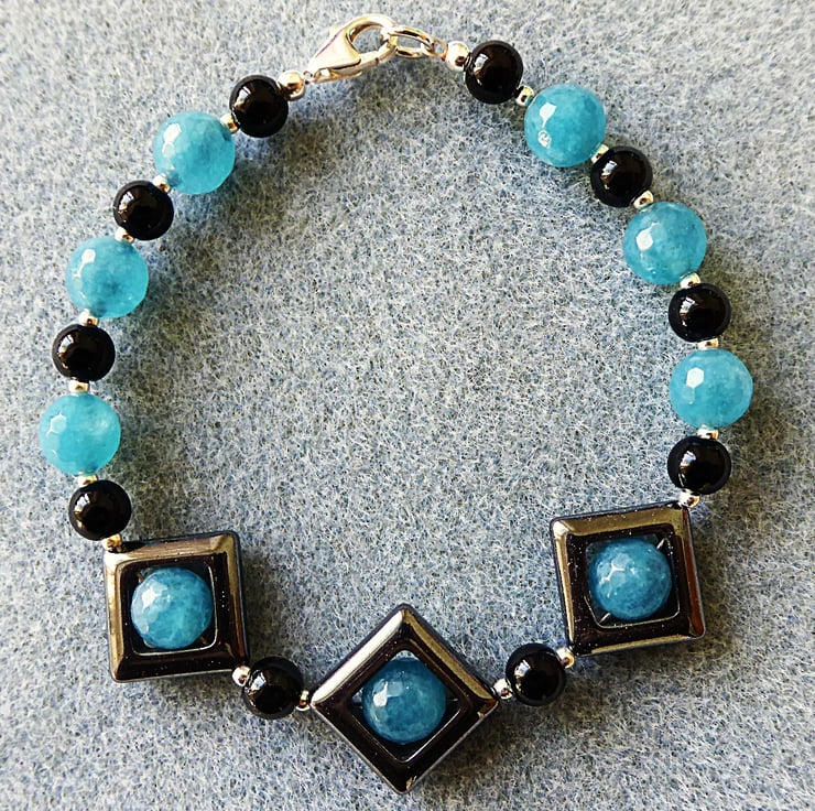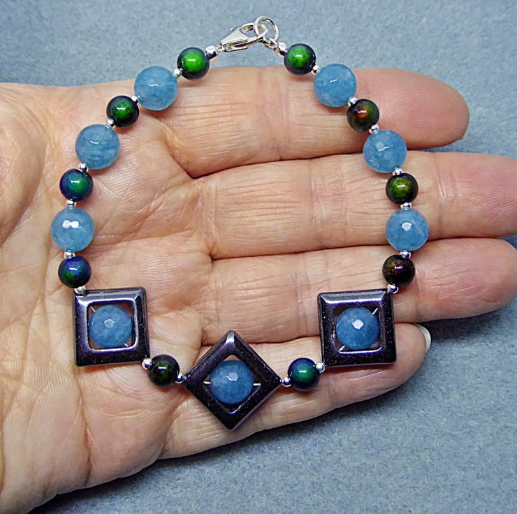 This unusual and striking bracelet combines faceted green agate beads with diamond shaped haematite/hematite frames and mood beads.