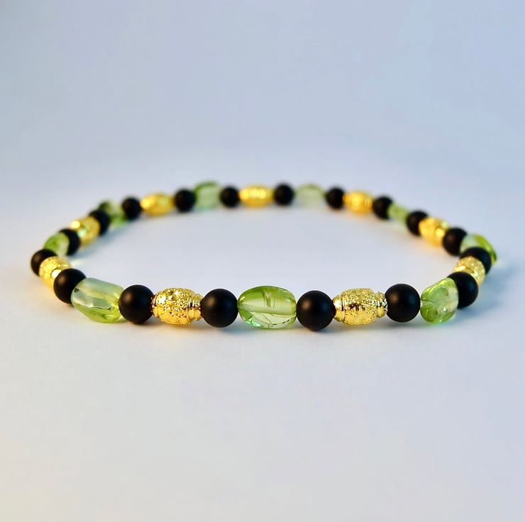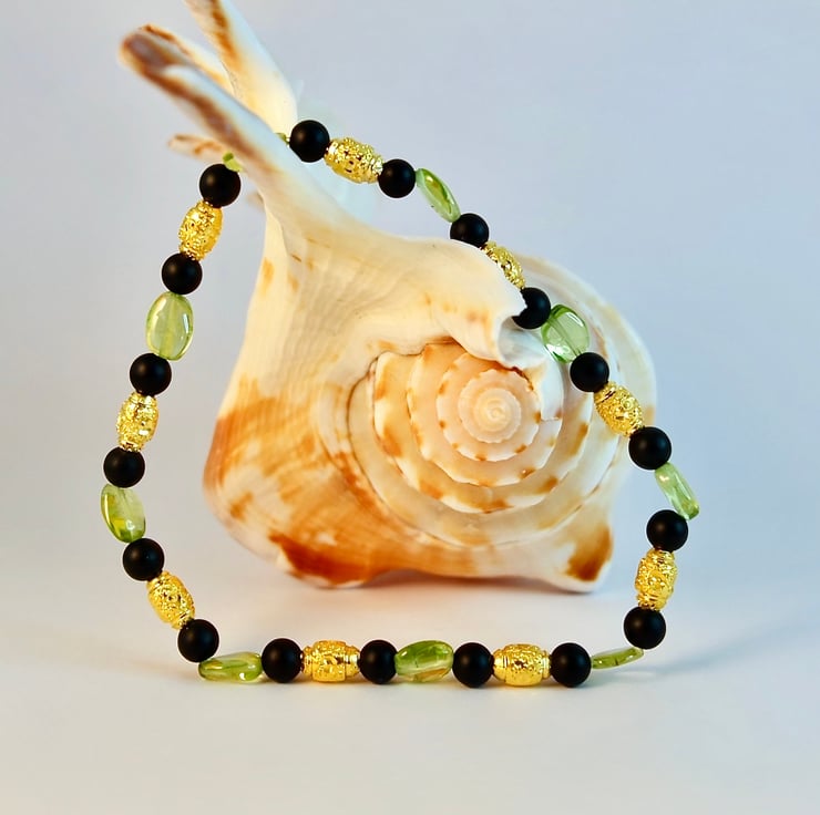 The Peridot ovals are a translucent, fresh apple green and the golden beads are coated iron with a sparkly finish that is emphasised by the matt black of the Onyx.