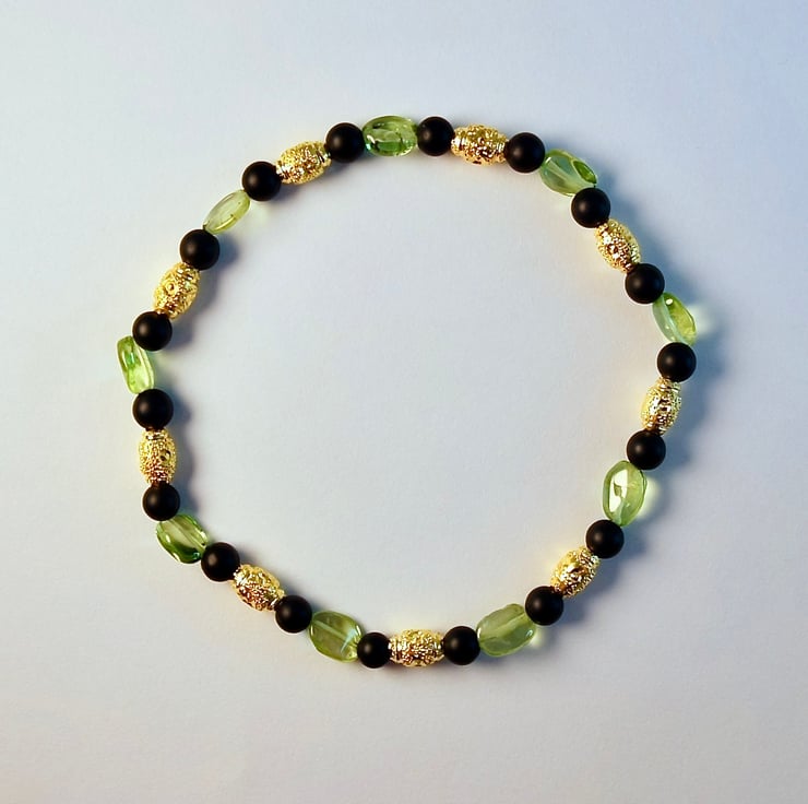 Pretty stretch bracelet featuring 5-7mm Peridot ovals, 4mm frosted black Onyx rounds and 6x4mm sparkly gold rice beads.
