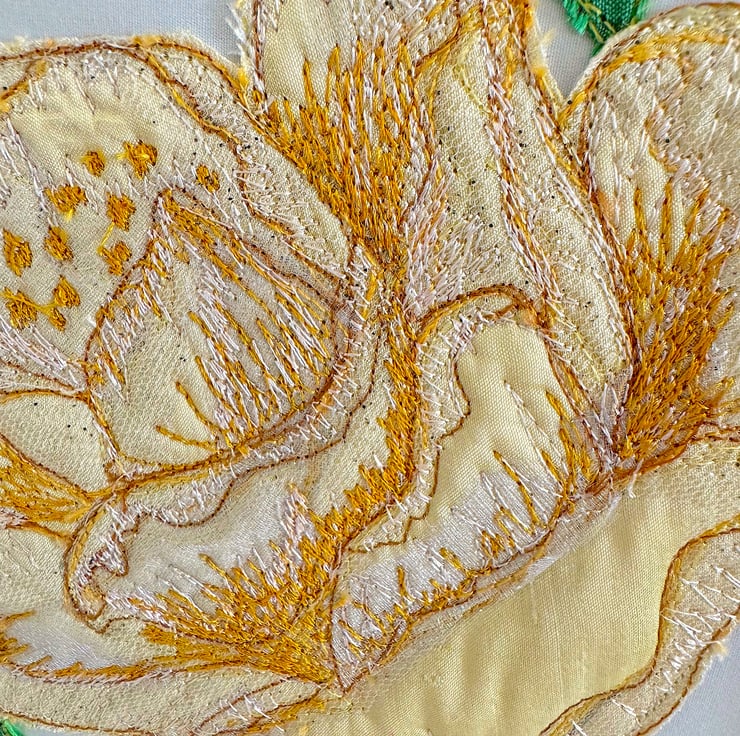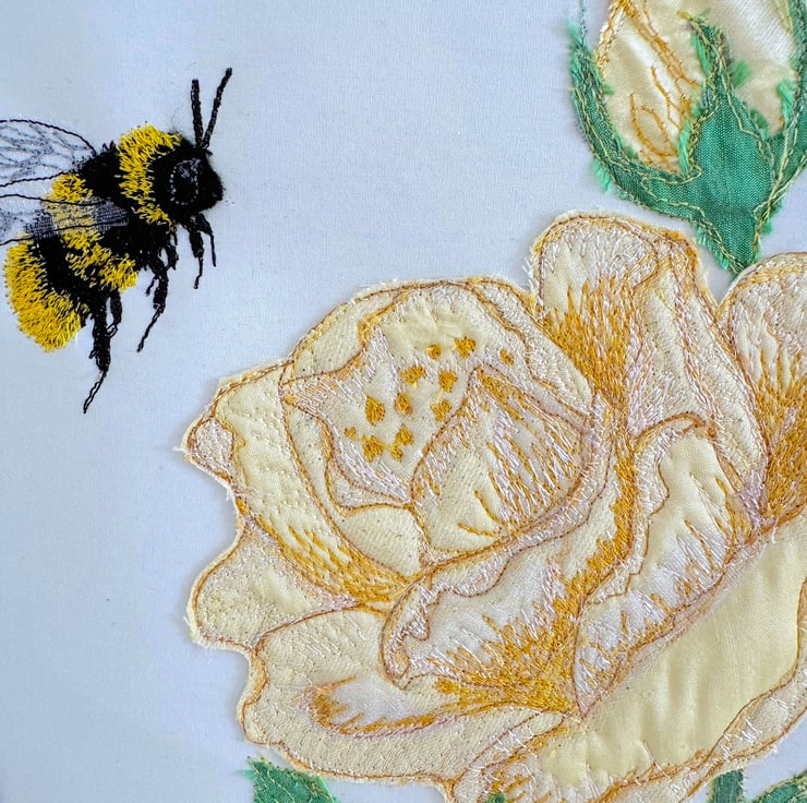 It shows an applique yellow rose, cut from yellow silk and embroidered with free machine embroidery, which is where the artist uses the sewing machine needle like a pencil to drawn freehand onto fabric. The same embroidery technique is used to draw a gorgeous bumble bee freehand (NOT a computer programme). The leaves of the rose are cut from green silk and the background is a lovely pale blue cotton.