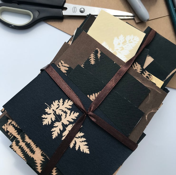 There is 1 bundle for sale, containing 50 pretty paper off-cuts in various shades of Black, Chocolate Brown, Dark Brown and Ochre with touches of Beige and Coffee colours. Some have a faded look others have strong colours and patterns, due to the Cyanotype creation. For more information on Cyanotype Photograms see 'about' in my shop front.