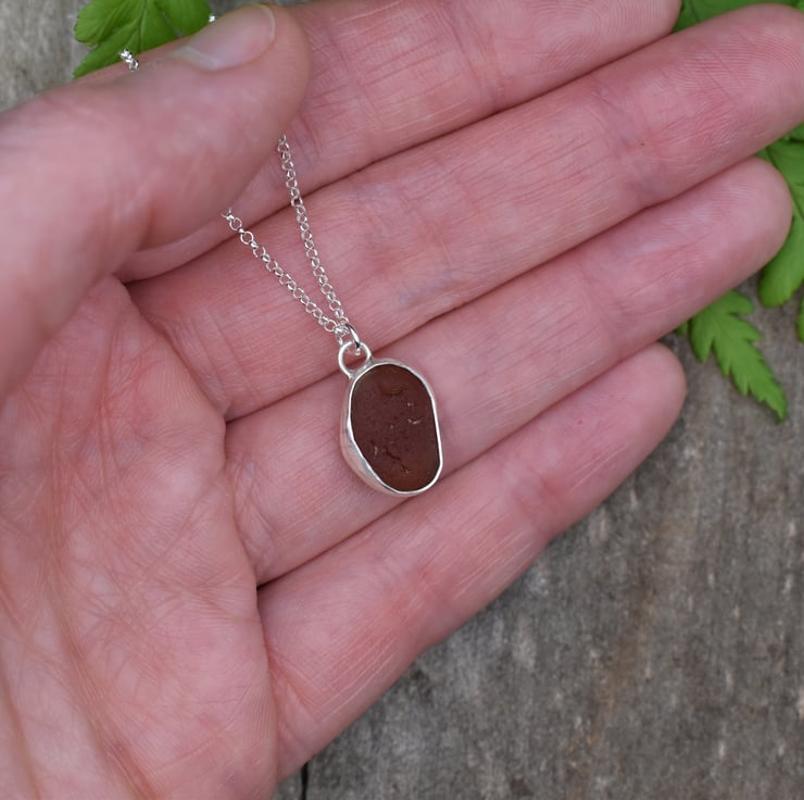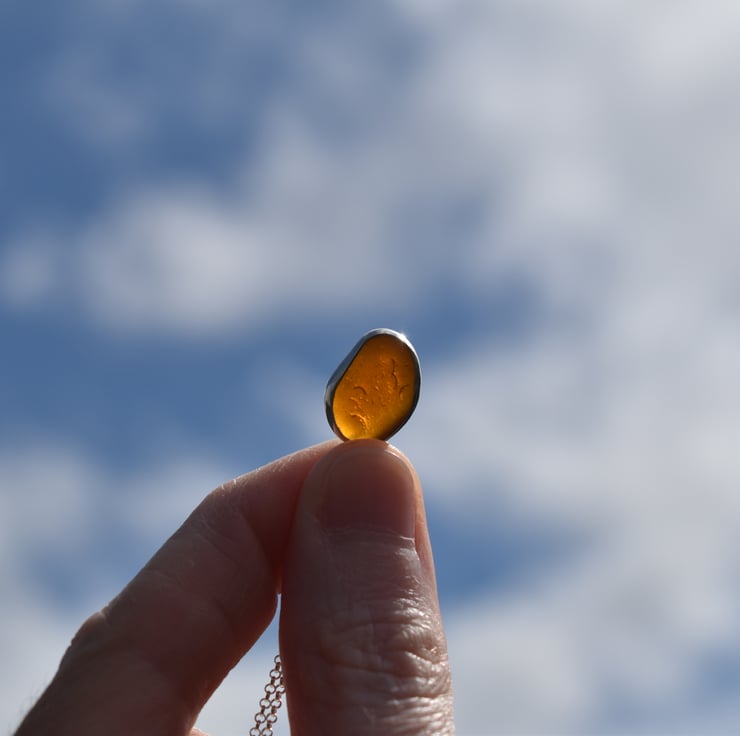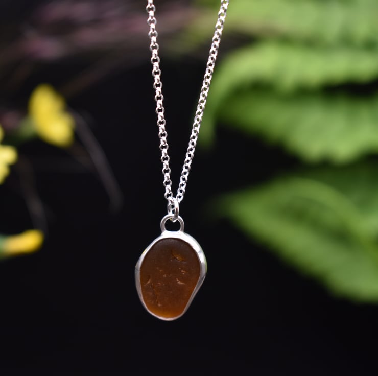 This necklace features a lovely little piece of amber sea glass collected from a local Highland beach. The glass is wrapped in a fine silver open-backed bezel, which allows the light to shine through it. The pendant measures just over 1.7cm from the top of the bail. The pendant comes with a sterling silver belcher chain with a bolt ring clasp, in a length of either 45cm (18 inches) or 50cm (20 inches) - please specify when ordering which chain length you would prefer (please refer to length reference photo).