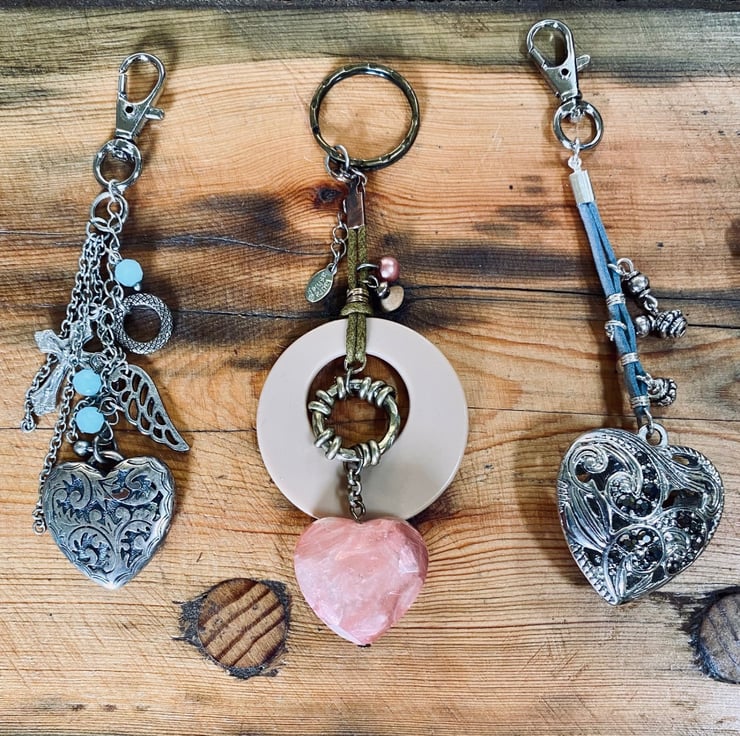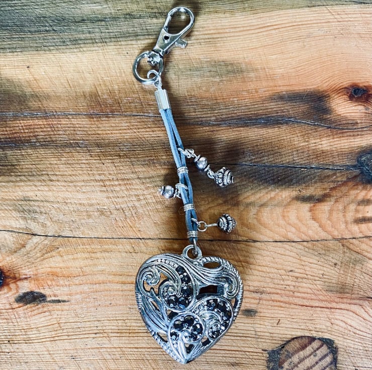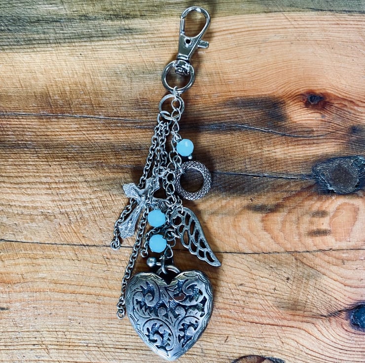 Gorgeous heart charms, oozing vintage style. These are larger in size, with lobster clasps or ring as pictured and suitable for use as keyrings or bag charms. Handmade from upcycled and recycled materials, each of my bag charms is one of a kind and a fabulous way to personalise your bags, jackets, purses and more… anything with a zipper or ring to hook onto.