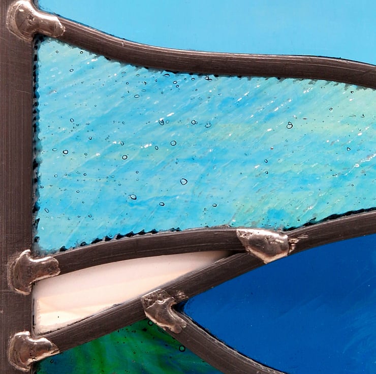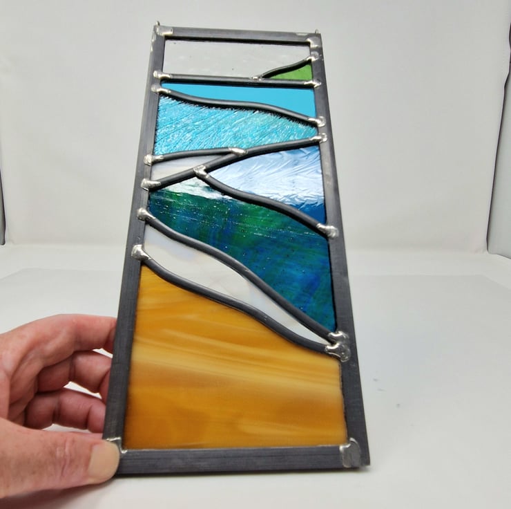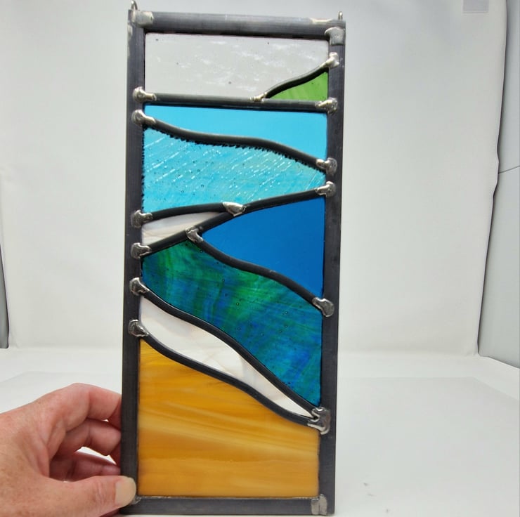 The beach scene has a clear textured sky. This sits over one green hill in strong green.The blue sea has been cut from four interesting turquoise and blue pieces of glass. A particularly beautiful swirled green/blue in the centre draws the eye. Two wave tops have been created in a soft wispy white.