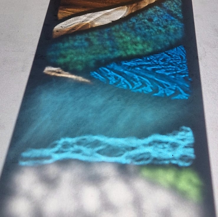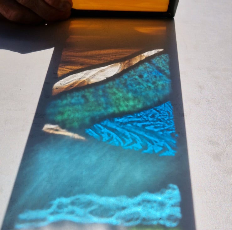 The beach is a translucent streaky strong amber bringing the whole panel together creating an atmospheric piece.