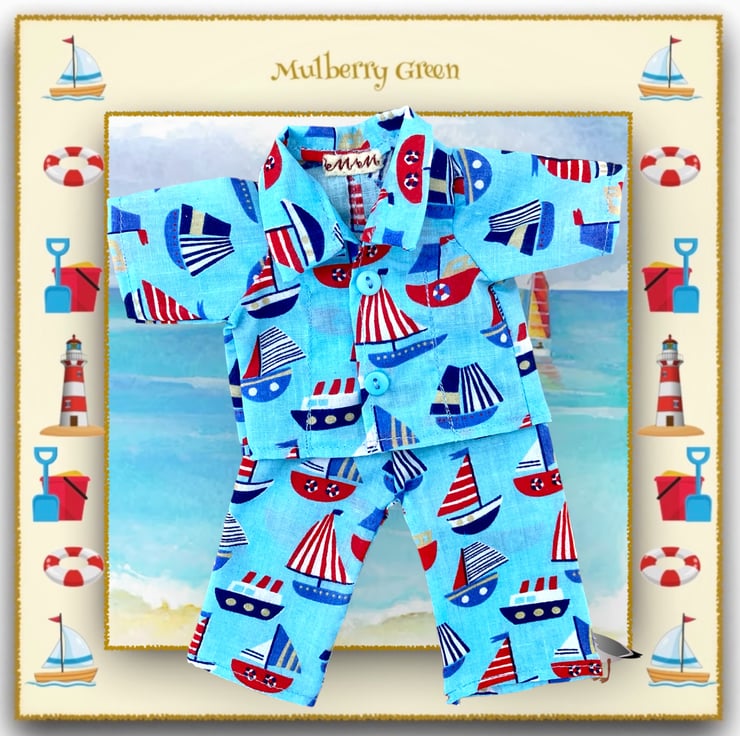 A cute little pair of sailing regatta pyjamas to fit the Mulberry Green characters. The pyjamas are made from best polycotton and are tailored like real pyjamas. They fasten with poppers under two little buttons.
