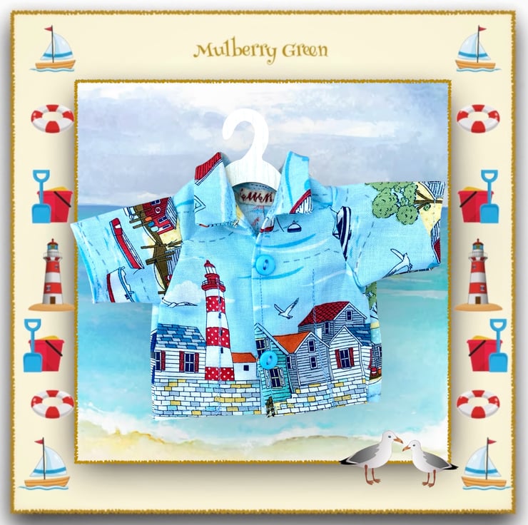 A cute little short sleeved shirt to fit the Mulberry Green characters. The shirt is made from best quality cotton in a little harbour town’s print and fastens with poppers underneath the buttons. It looks lovely with the cords or jeans.