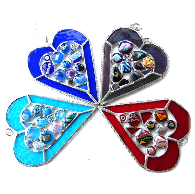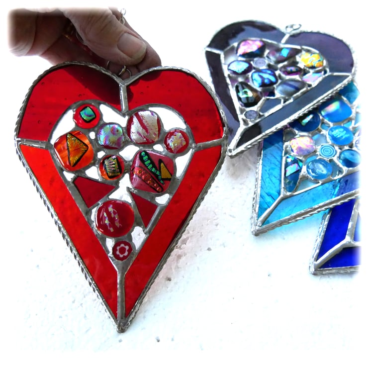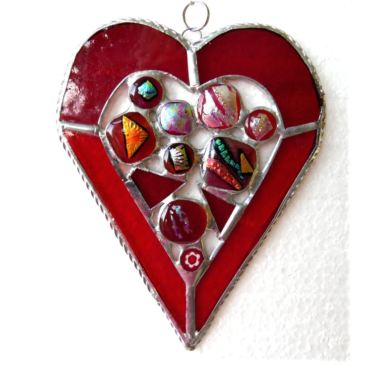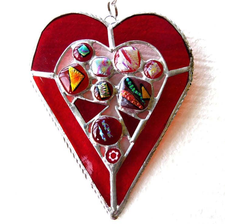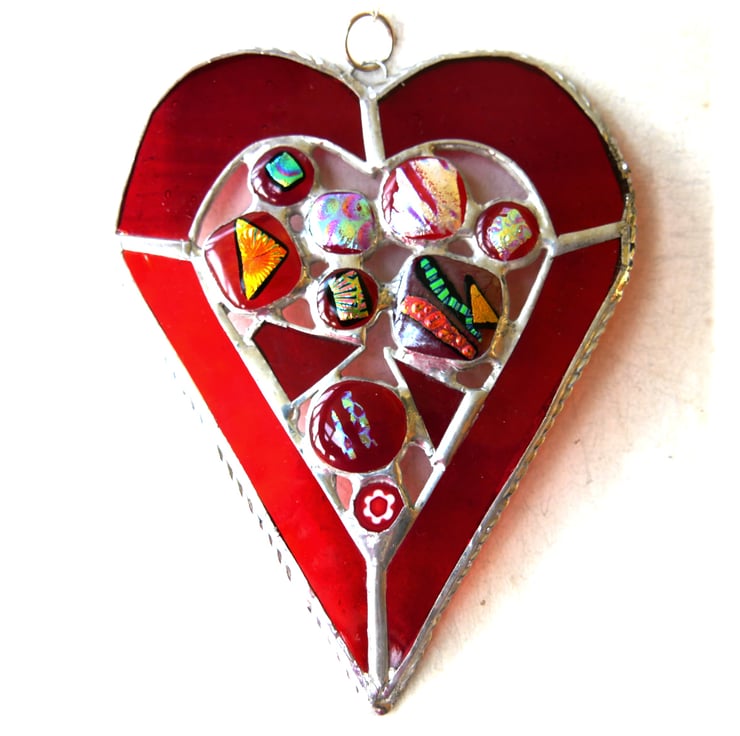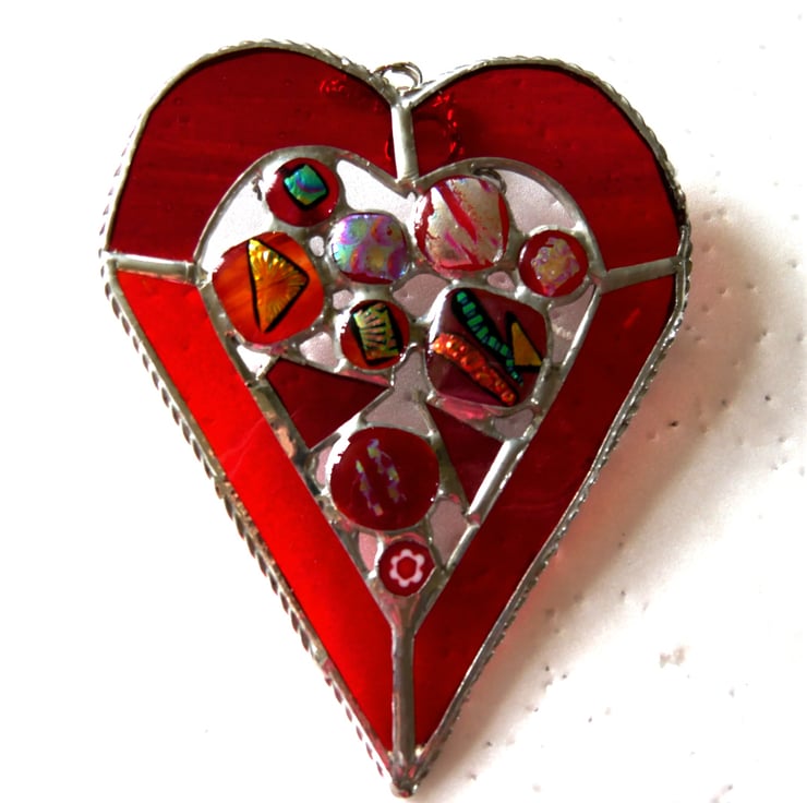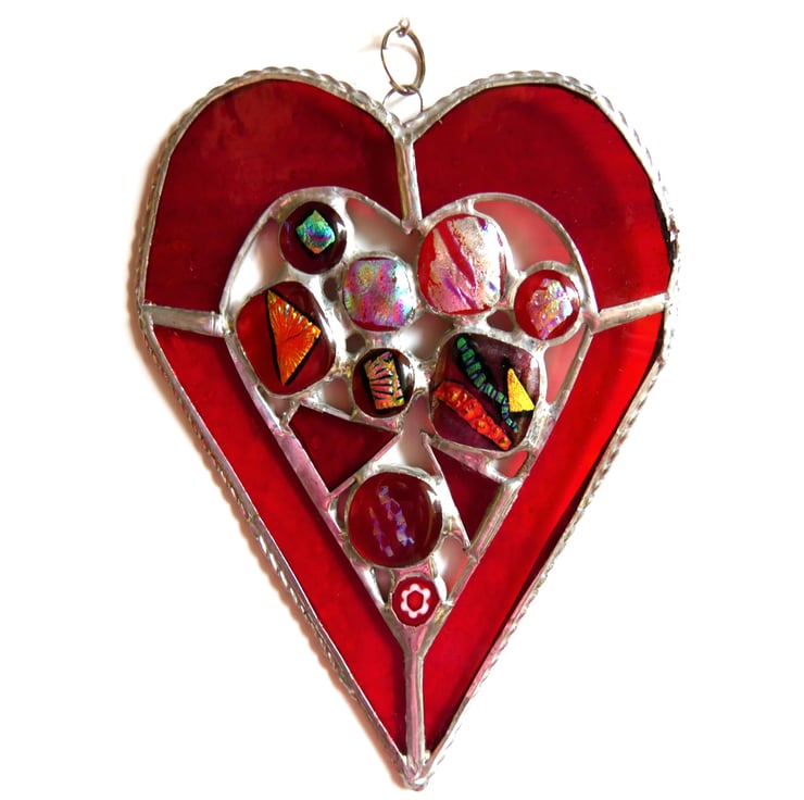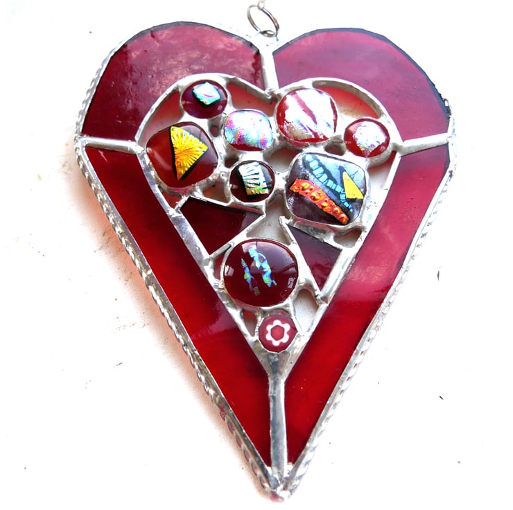 It is 14cm x 11cm and the heart border is cut from two types of bright red glass, which is strengthened round the edge with twisted wire..