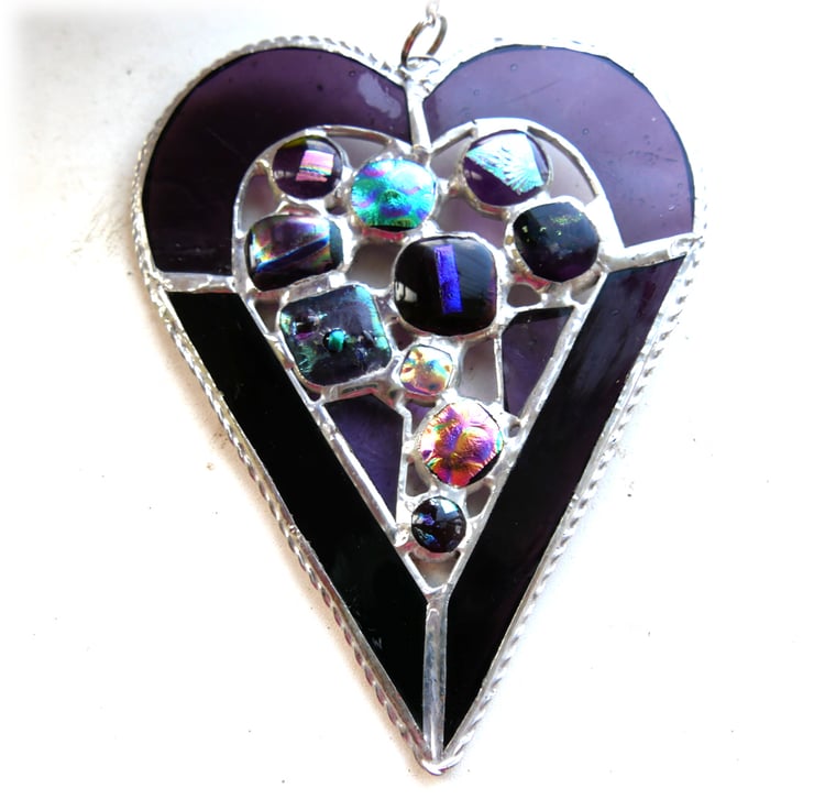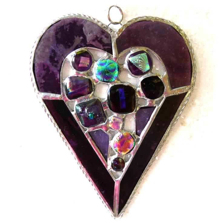 It is 14cm x 11cm and the heart border is cut from two types of deep rich purple glass, which is strengthened round the edge with twisted wire..
