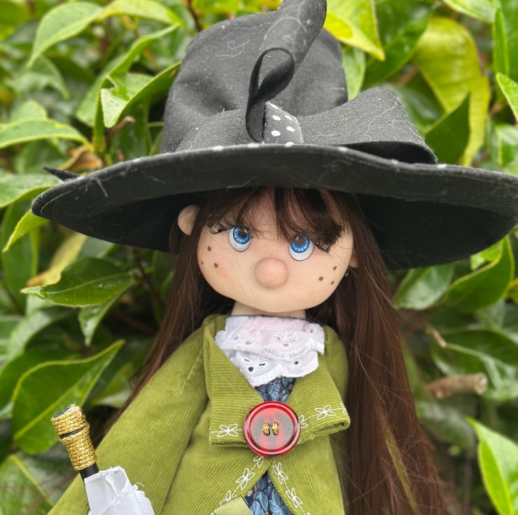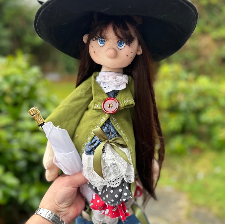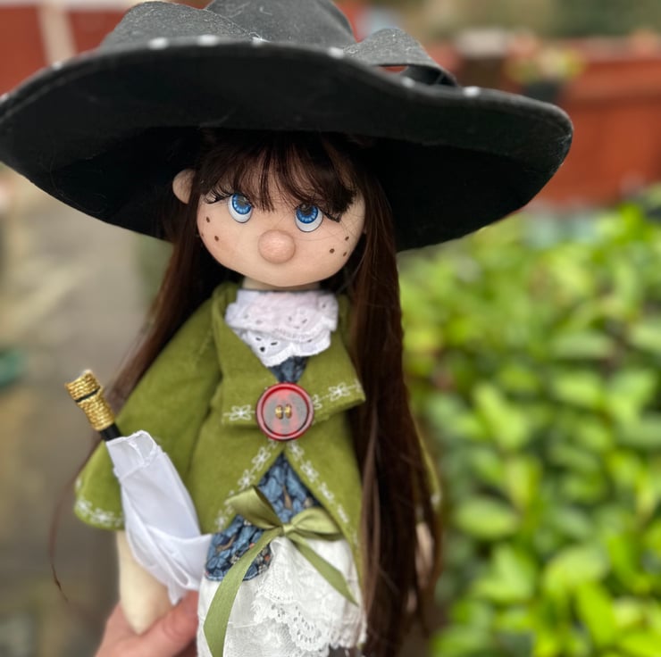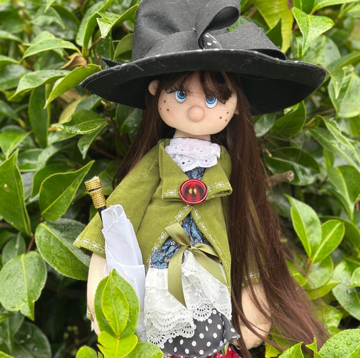 Discover the charm of this very unique handmade OOAK doll with an umbrella crafted with care. Made from high-quality cotton and corduroy fabric, this doll features a flexible wire skeleton running through her body, allowing for a wide range of expressive poses.