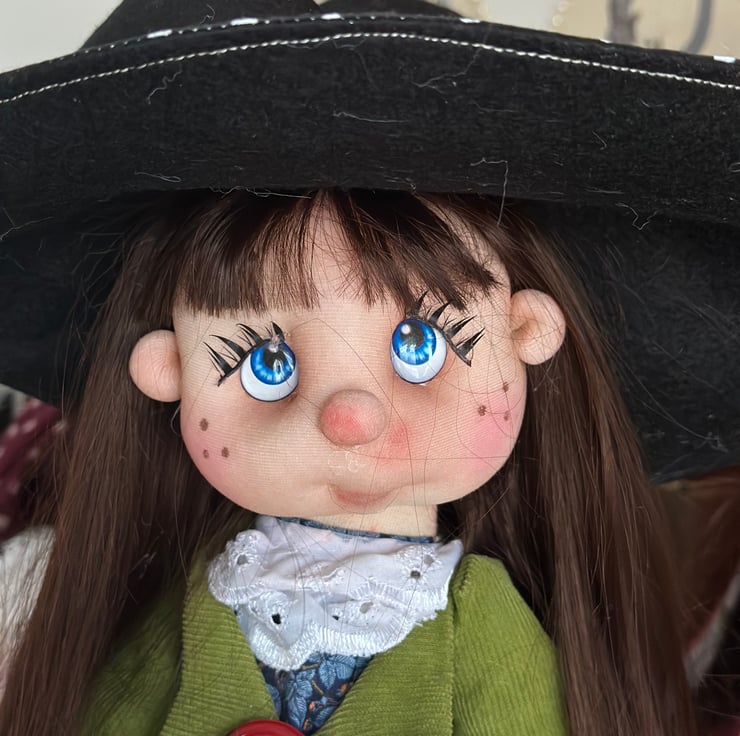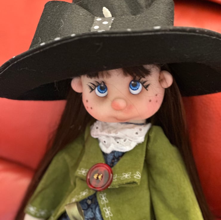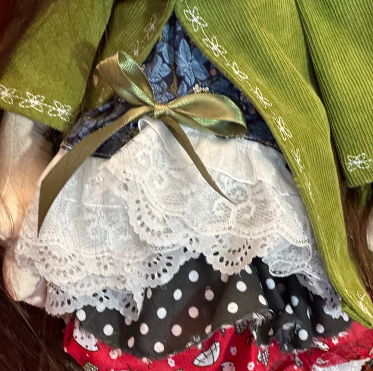 This adorable doll is dressed in a multilayer, colourful dress and a corduroy, embroidered green jacket. Wearing blue shoes with a matching jacket embroidery.