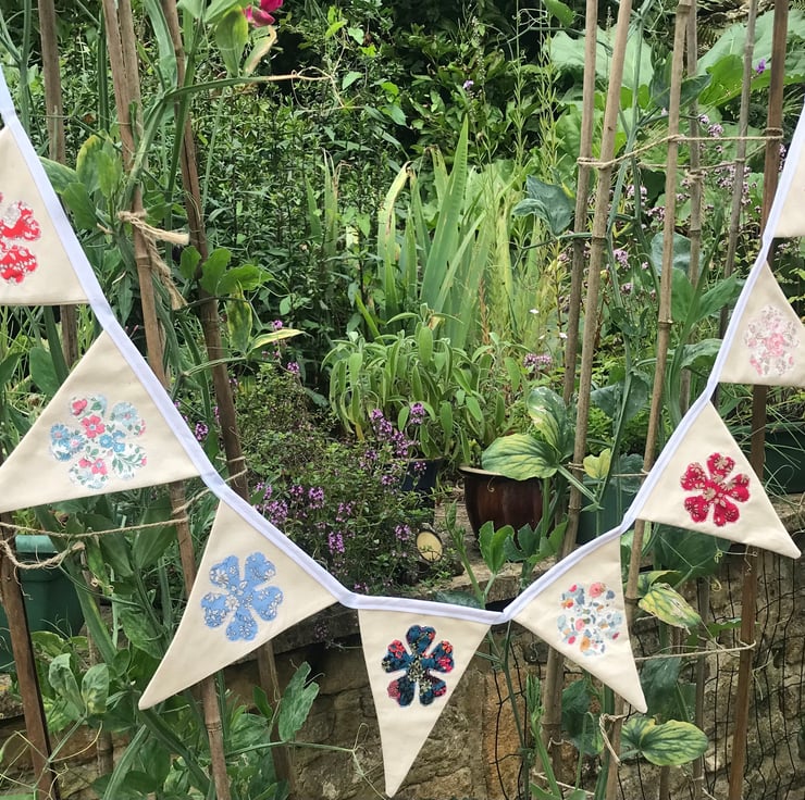 Pretty Liberty flower bunting on plain calico triangles . Each flower is appliquéd on and there are 8 different flower fabrics