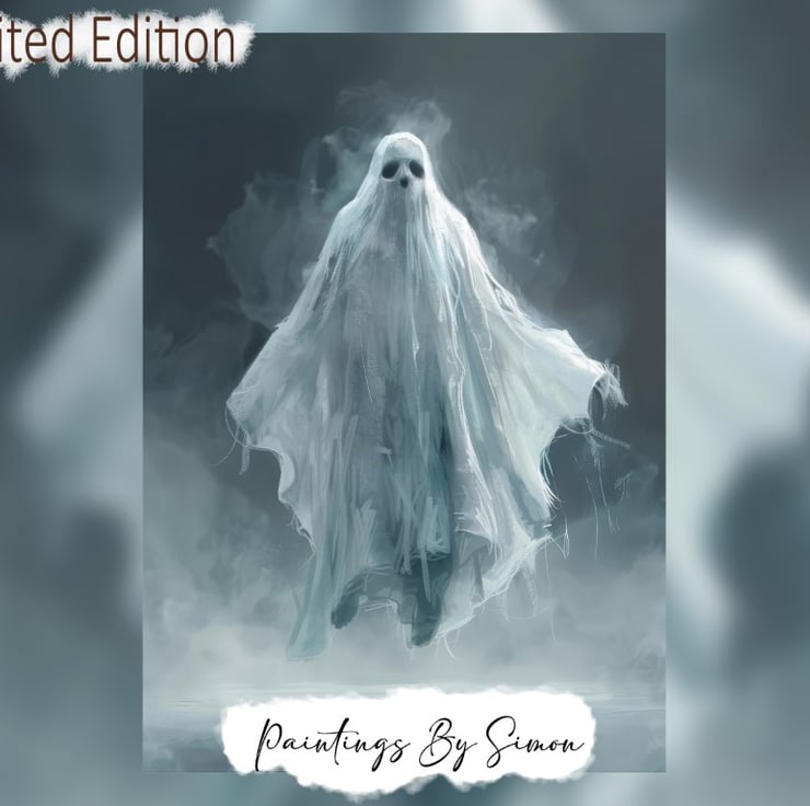 This limited edition print, titled "Haunting Ghostly Apparition," captures the eerie and ethereal presence of a ghostly figure. Moreover, the artist has masterfully depicted the apparition with a hauntingly beautiful and detailed approach. The ghost, shrouded in translucent white, seems to float effortlessly against a dark, misty background, creating a stark contrast that draws the viewer's eye to the central figure.