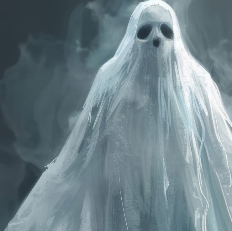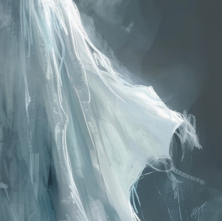 Additionally, the figure's eyes are hollow and dark, adding to the ghostly and unsettling nature of the image. The flowing, tattered robes of the apparition appear to move with an otherworldly grace, suggesting a sense of perpetual motion. The use of soft, muted tones enhances the spectral quality, making the ghost seem both real and unreal at the same time.