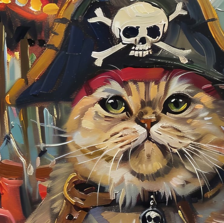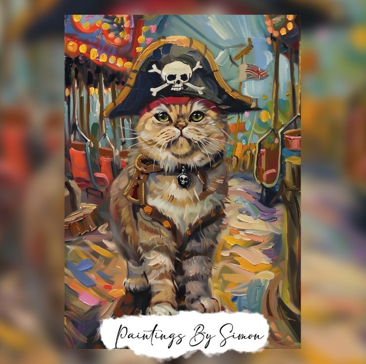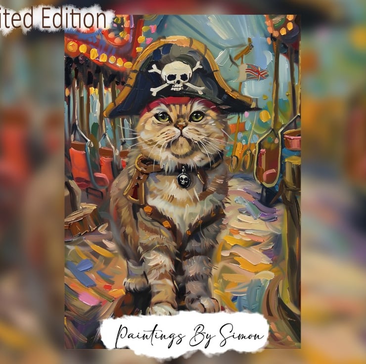 This limited edition print, "Adorable Pirate Cat,". Captures a whimsical and charming scene that will delight cat lovers and pirate enthusiasts alike. Moreover, the central figure, a fluffy cat. Is dressed in a pirate costume complete with a hat adorned with a skull and crossbones. The cat’s expressive eyes and playful demeanor bring a sense of fun and adventure to the artwork.