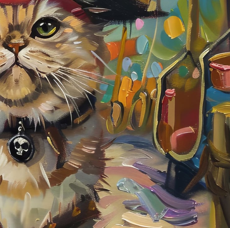 Additionally, the background is filled with vibrant colors and dynamic brushstrokes, creating an energetic atmosphere that complements the pirate theme. The use of bold hues and lively patterns draws the viewer’s eye across the entire piece. Making it a visually engaging experience. The artist has skillfully blended these elements to create a cohesive and captivating composition.