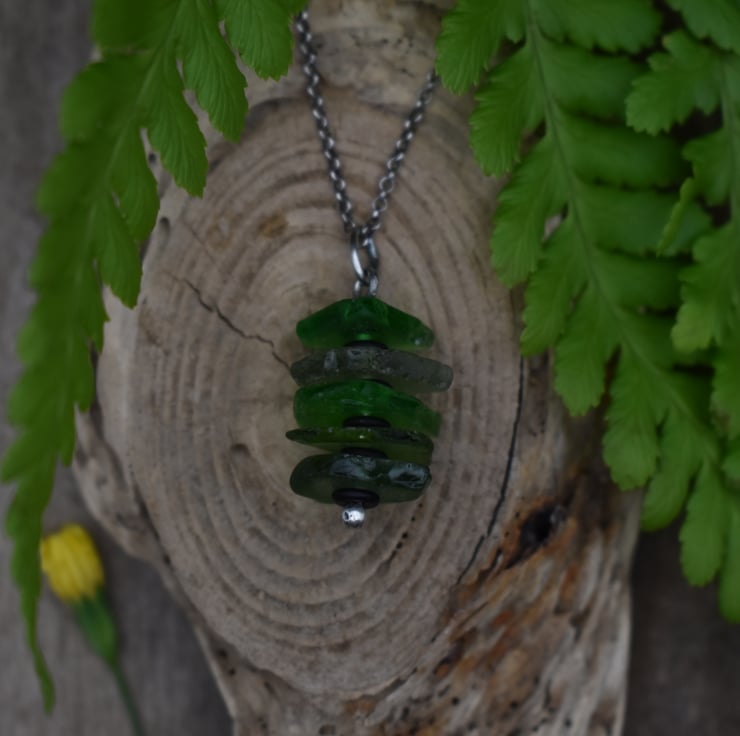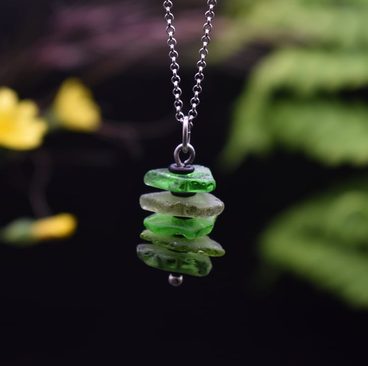 This necklace has been made using recycled sterling silver, and sea glass collected locally in the Scottish Highlands. It features five stacked pieces of sea glass in various shades of green, and all the sterling silver components have been oxidised using liver of sulphur to give an antiqued finish. The pendant measures approximately 2.3cm. It comes with a sterling silver belcher chain with a bolt ring clasp, in a length of either 45cm (18 inches) or 50cm (20 inches) - please specify when ordering which chain length you would prefer (please refer to length reference photo).