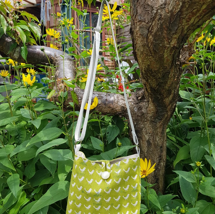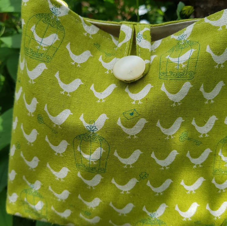 This contemprary bird design cotton linen look fabric makes a lovely crossbody bag. It measures approx 20cm tall x 20cm wide and is 5cm at the base. The strap extends from 60cm to 110cm and is made from a strong cotton webbing, and I add an addition row of top stitching where the strap attaches to add strength.