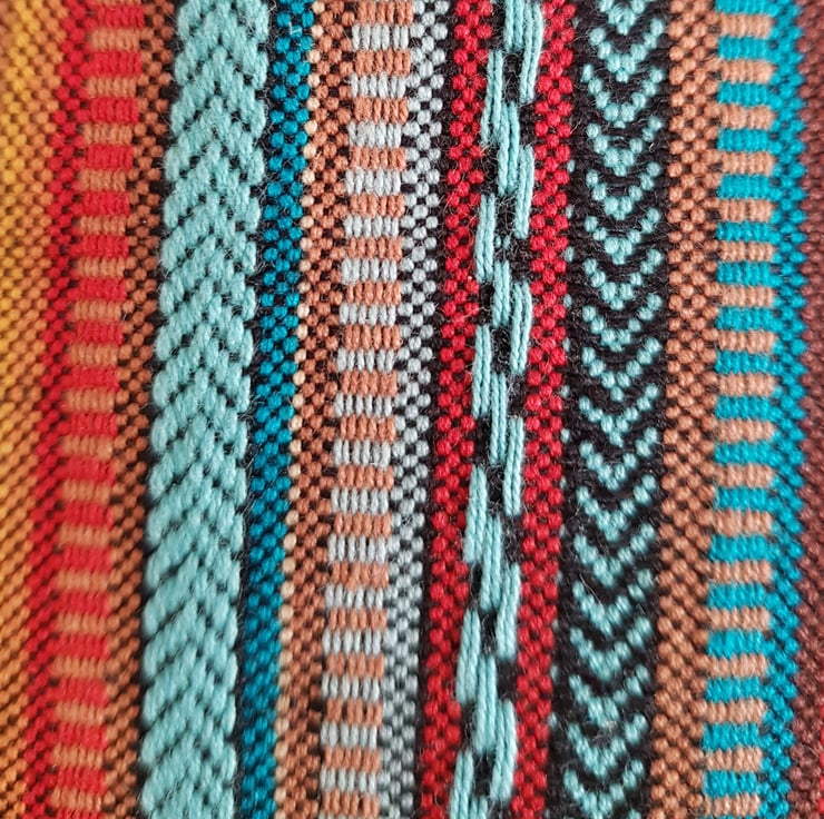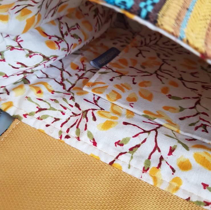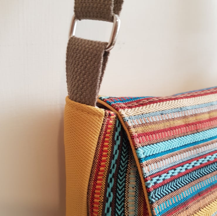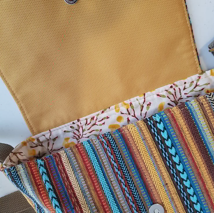 This cheerful woven fabric makes an attractive snd useful crossbody bag. I have chosen a coordinating ochre canvas for the back, and the bag is lined with an Indian block print cotton.