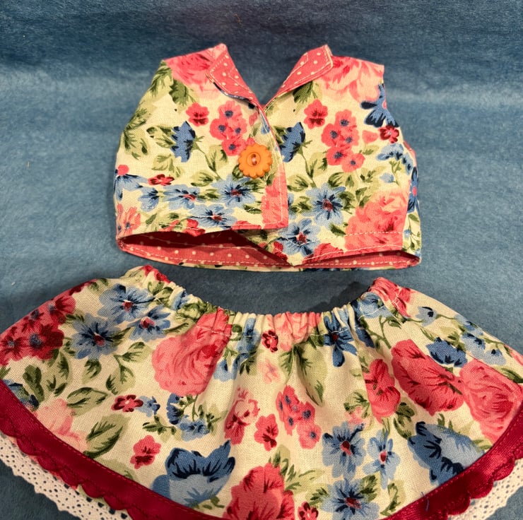 Waistcoat and skirt. The skirt has an elastic waist and is trimmed with ribbon and lace.