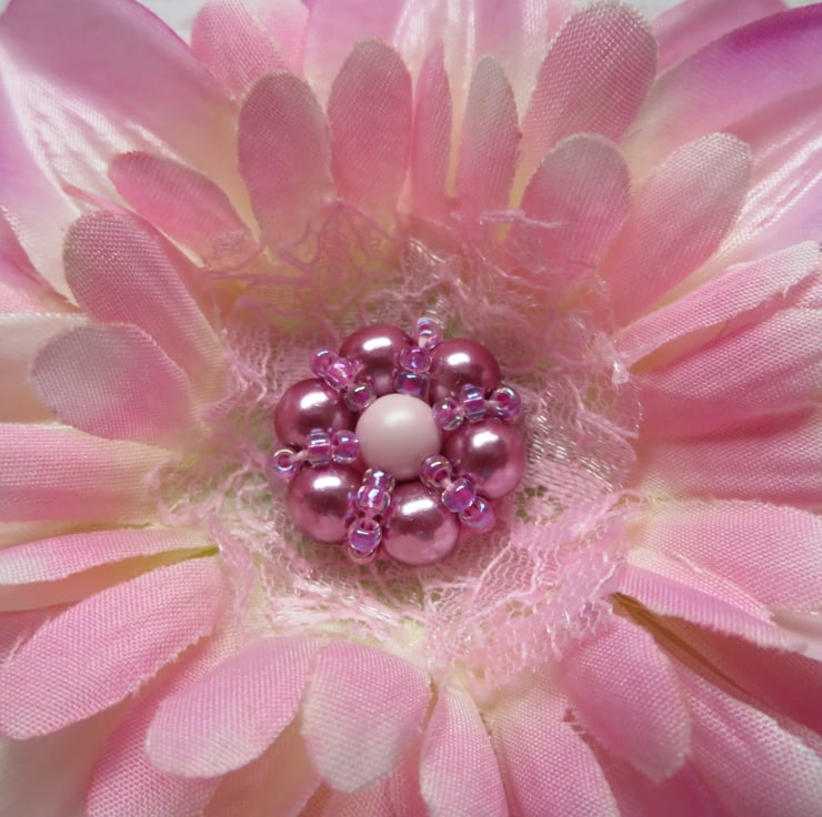 Finished with pale pink lace and a beaded cluster of lavender pearls with a pale pink one in the centre and lavender bugle beads to finish.