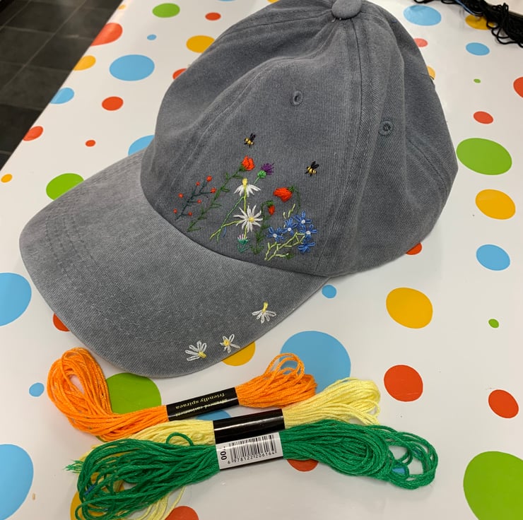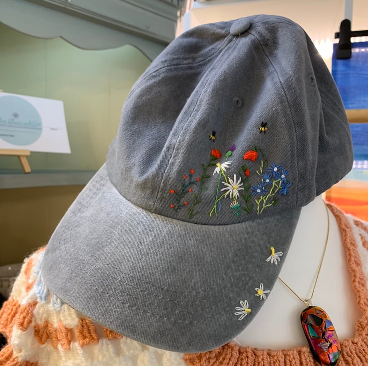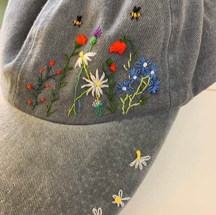 Hand embroidered with floral and bumbles this baseball cap in grey is fully adjustable and made from 100% cotton