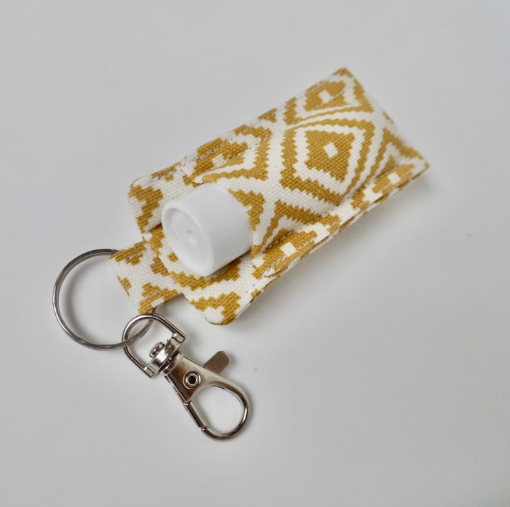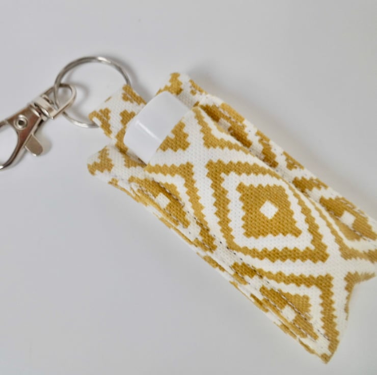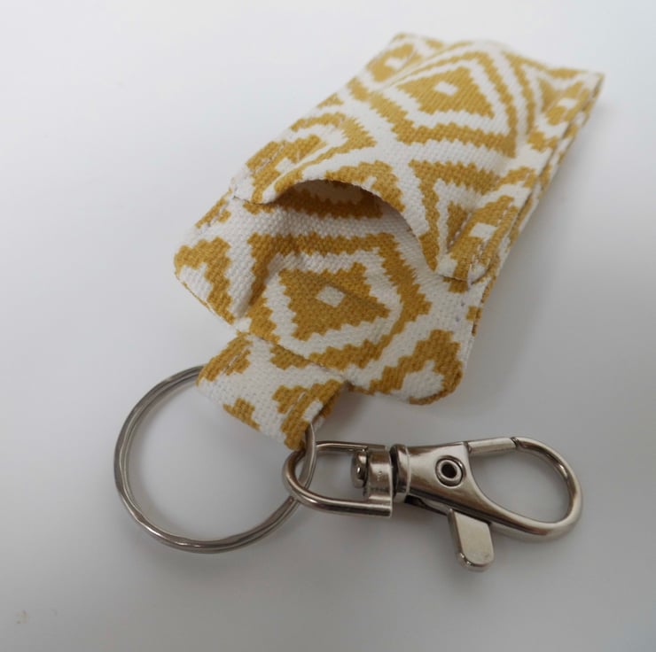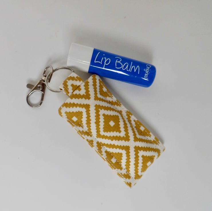 This is a little fabric pouch designed to keep your lip balm stick handily clipped to your bag, purse etc. For this one, I used a furnishing weight cotton with a geometric print in yellow ochre.
