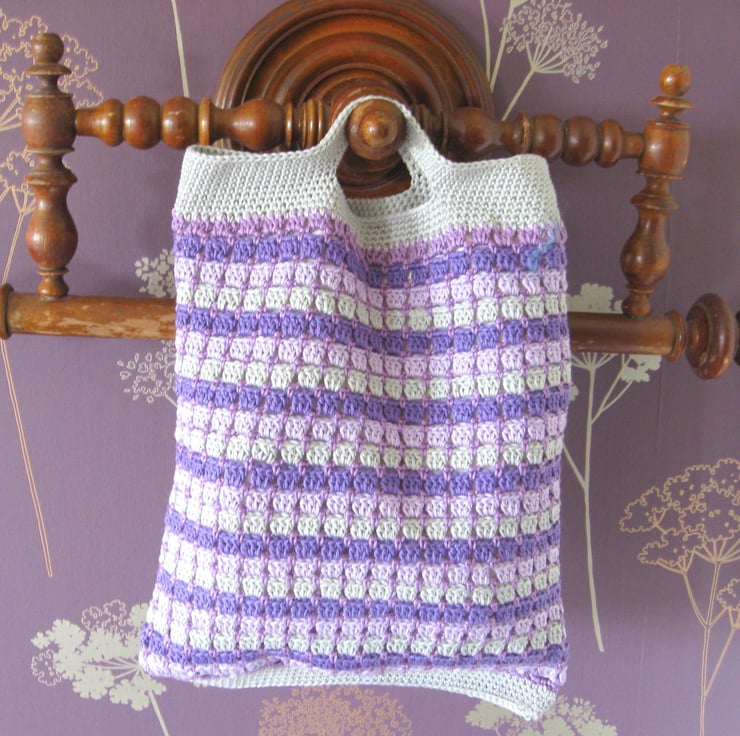 It's a very useful size and this particular bag measures 13in by 11in (33cm by 28cm) but you can make it larger or smaller by varying the number of rows and stitches. I have used double knitting to make these but you can use any yarn as long as you use a suitably sized crochet hook. If you have any problems with the pattern, please contact me and I will try to help you. I use mine when I go to my book group and also to carry small pieces of crochet around with me. I sold one to a customer who wanted to use it to carry a small tablet/laptop around. It has many uses and can be rolled up.